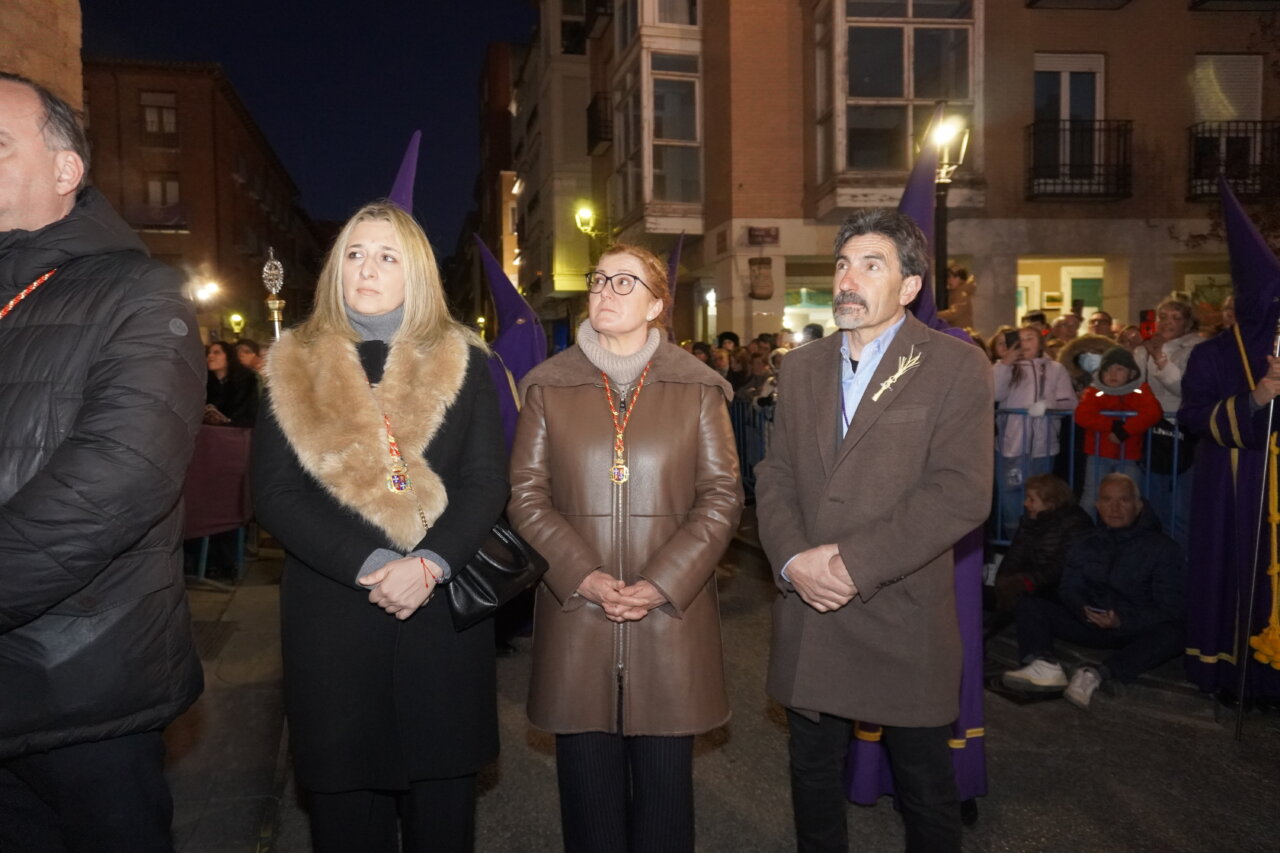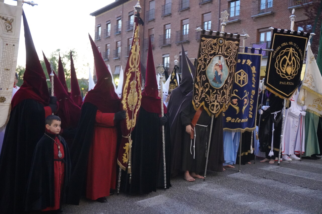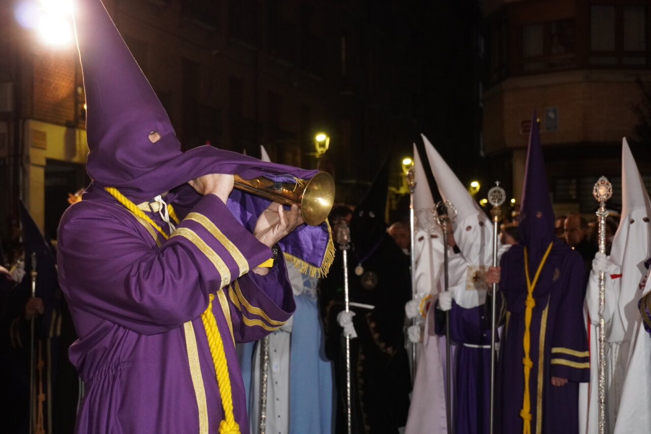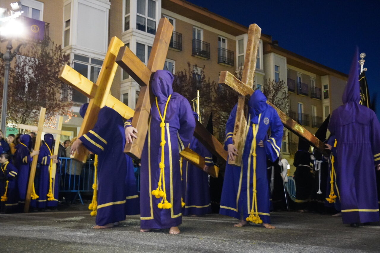 «Nadie me quita la vida: soy yo quien la entrega voluntariamente». Con estas palabras, leídas ante el templo de San Miguel, la Semana Santa palentina ponía en valor anoche la valentía y dignidad de Cristo al ser traicionado por Judas y capturado. Palabras que precedieron a uno de los momentos más singulares e identificativos de nuestras tradiciones: La Procesión del Prendimiento, que partió este Martes Santo a las 20:00 horas desde la Capilla de Jesús Nazareno. Desde este punto salió la comitiva de hermanos de la cofradía, acompañando el paso de “La Traición de Judas”, para recrear la escena del prendimiento de Jesús en el Huerto de los Olivos, en dirección a la iglesia parroquial de San Miguel.