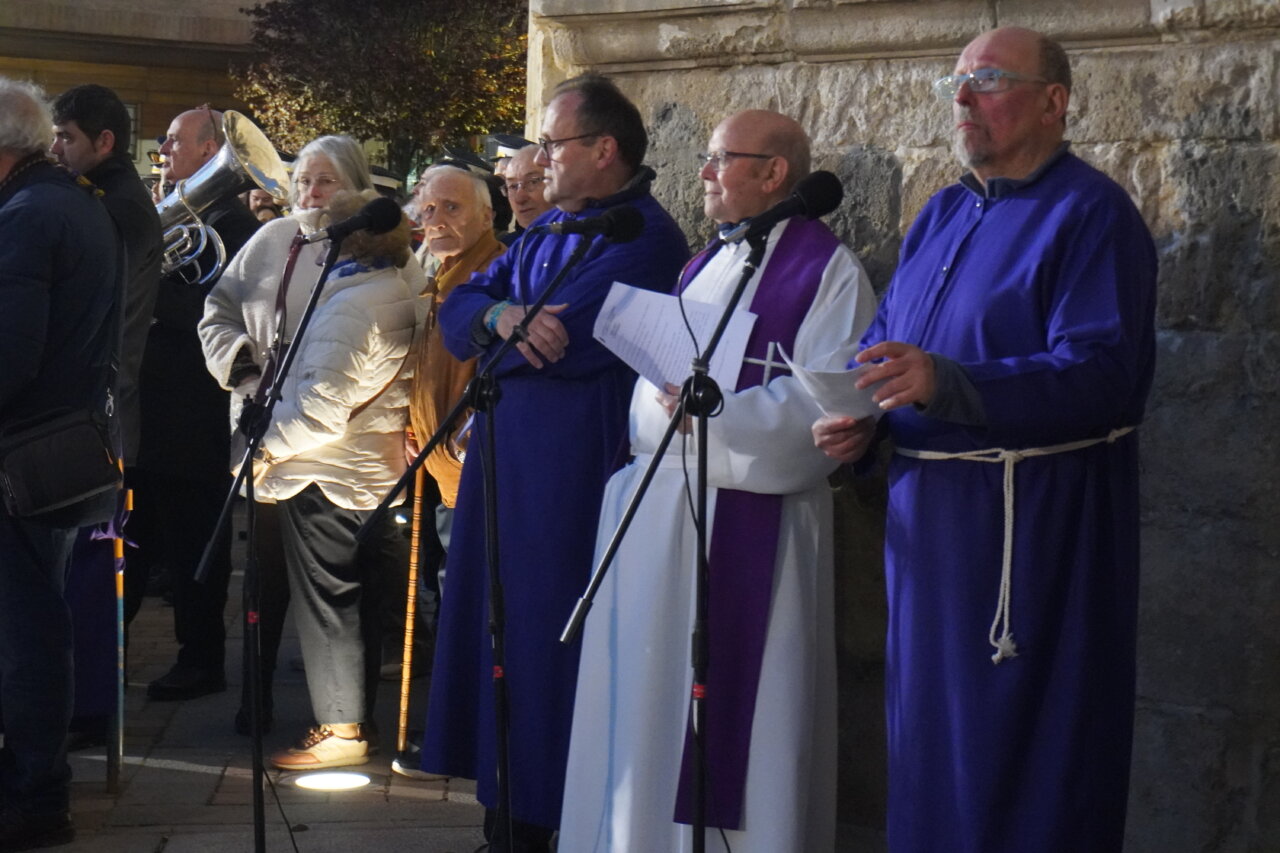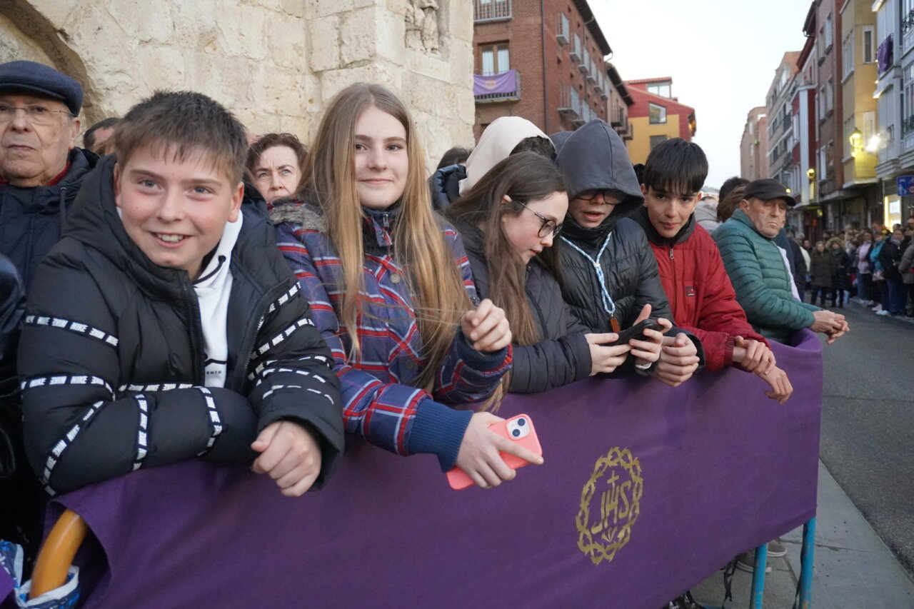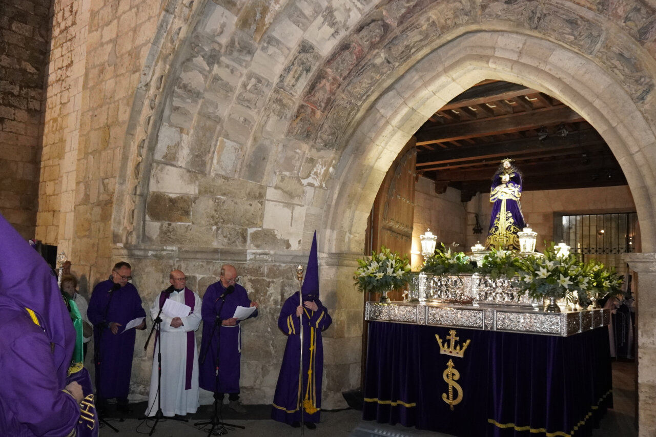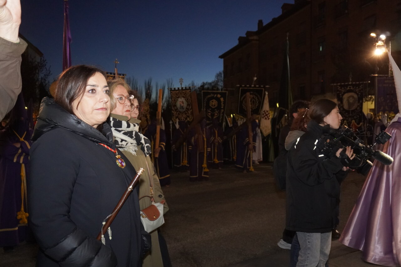 «Nadie me quita la vida: soy yo quien la entrega voluntariamente». Con estas palabras, leídas ante el templo de San Miguel, la Semana Santa palentina ponía en valor anoche la valentía y dignidad de Cristo al ser traicionado por Judas y capturado. Palabras que precedieron a uno de los momentos más singulares e identificativos de nuestras tradiciones: La Procesión del Prendimiento, que partió este Martes Santo a las 20:00 horas desde la Capilla de Jesús Nazareno. Desde este punto salió la comitiva de hermanos de la cofradía, acompañando el paso de “La Traición de Judas”, para recrear la escena del prendimiento de Jesús en el Huerto de los Olivos, en dirección a la iglesia parroquial de San Miguel.