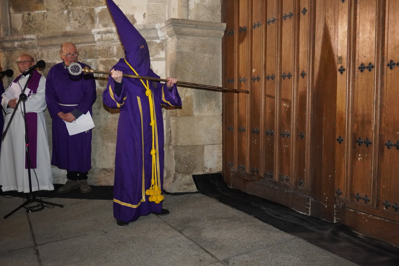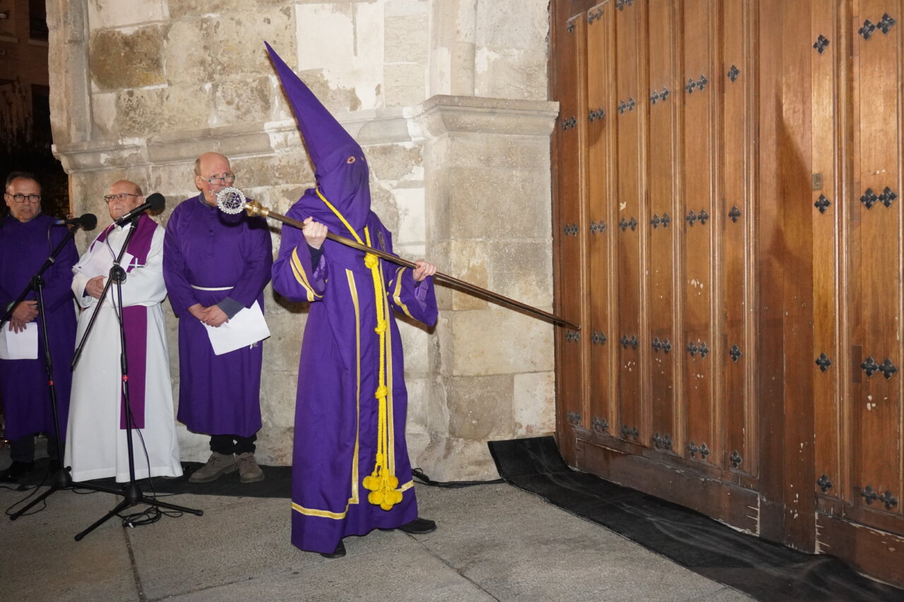 Un acto en el que se recitan los evangelios que narran el arresto de Jesús por los romanos tras la traición de Judas. Finalizada la lectura, un hermano de la cofradía golpea tres veces la puerta de la iglesia, en unos toques secos que se alternan con tres toques de tararú. A esta llamada se responde con la apertura de los portones, que permite la salida de la imagen del Cristo de Medinaceli, escoltada por sus cofrades, mientras la Banda Municipal interpreta el Himno de Medinaceli.
