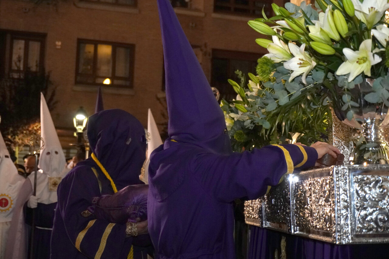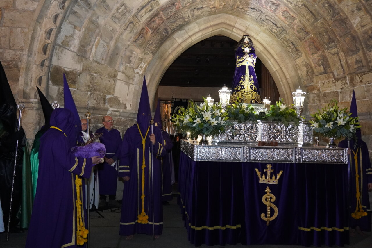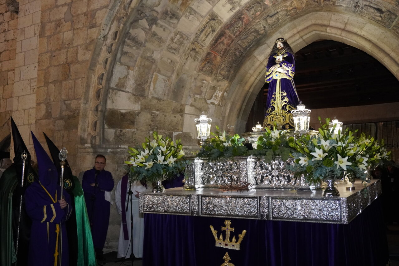 El acto concluye con un gesto simbólico que representa el cautiverio de Cristo, cuando un hermano nazareno coloca unas esposas a los pies de la imagen, mientras el paso de “La Traición de Judas” permanece frente a ella. A continuación, la procesión continúa por el centro de la ciudad, con paradas destacadas en la plaza Isabel la Católica (21:45 horas) y en la plaza de San Pablo (22:30 horas), donde se realizan oraciones antes de introducir la imagen del Cristo de Medinaceli al son de la marcha real interpretada por la Banda de Cornetas y Tambores de la Cofradía de Jesús Nazareno.