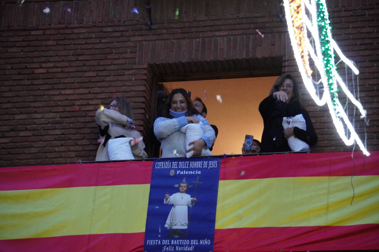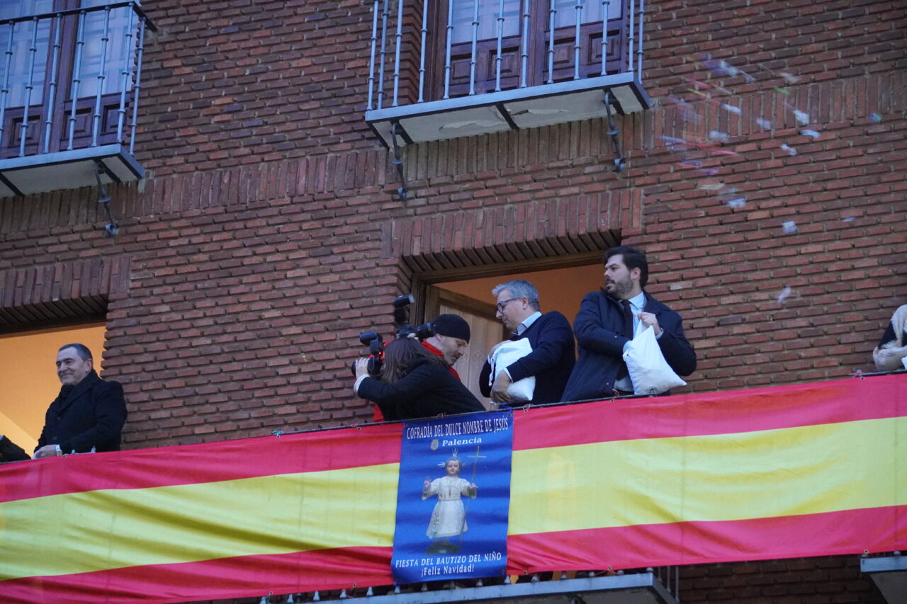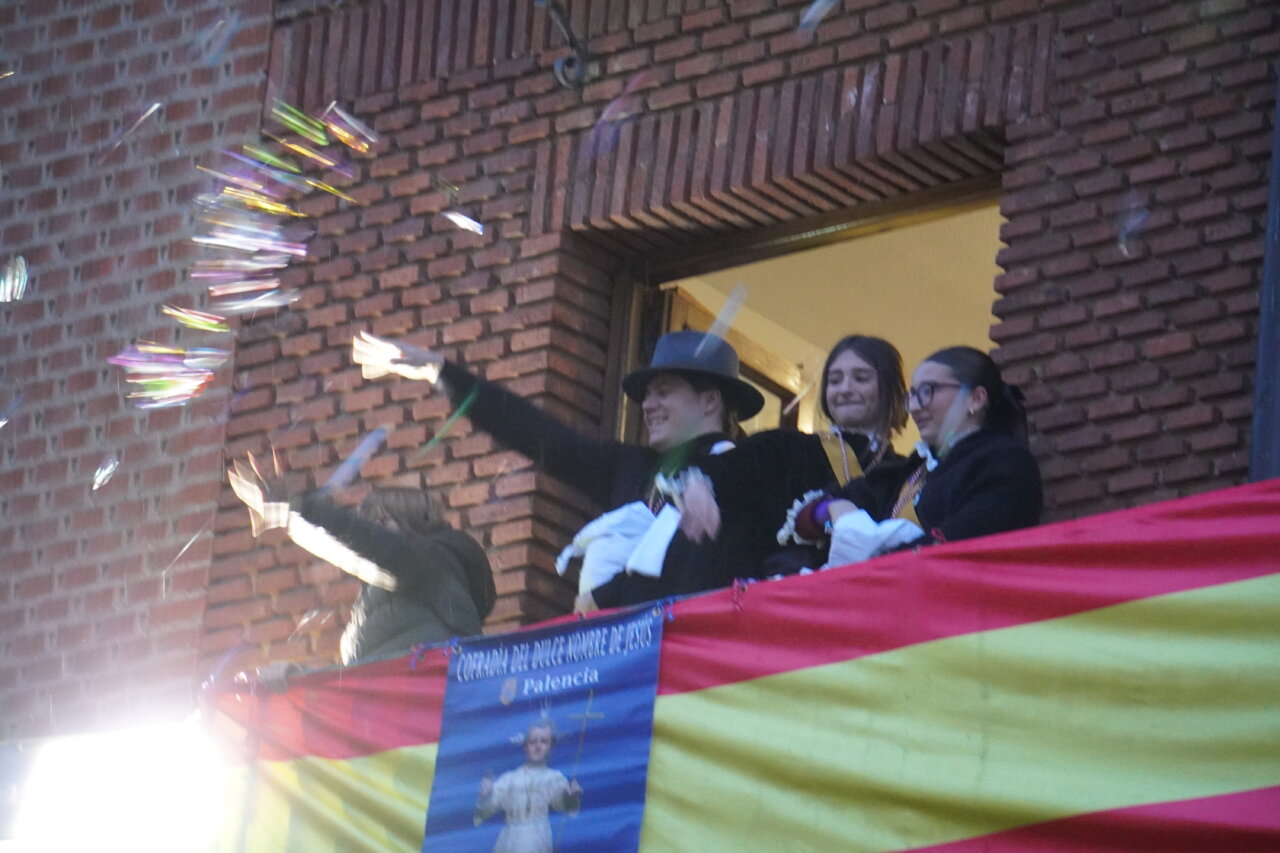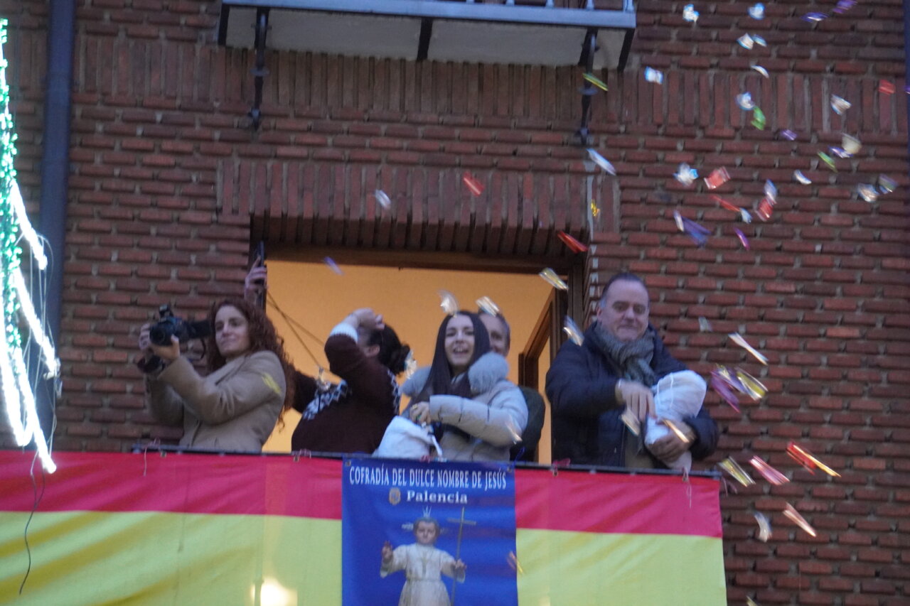 Una «pedrea» de caramelos que puso el colofón a una celebración que había comenzado con uan misa especial por la mañana y el tradicional «Rosario y renovación de las promesas del bautismo» en una abarrotada iglesia de San Miguel, a las 16:45 horas, presidido por el obispo de la Diócesis, a la que siguió la procesión dentro del templo y unos minutos fuera del mismo. Como manda la secular tradición, en el interior, encabezada por el estandarte de la Cofradía, las Hermanas y Hermanos Cofrades abrieron el paso bailando y meciendo al Niño al son del «Ea», acompañados por los dulzaineros y el coro de San Miguel, junto con el grupo de danzas “Dulce Nombre de Jesús» de la cofradía. No estuvo, esta vez, la Banda Municipal de Música de Palencia.