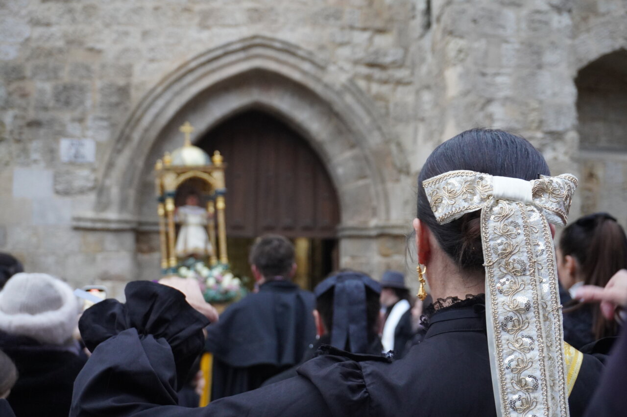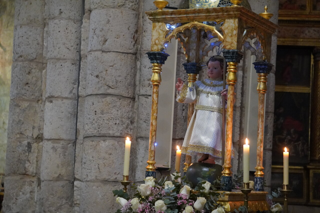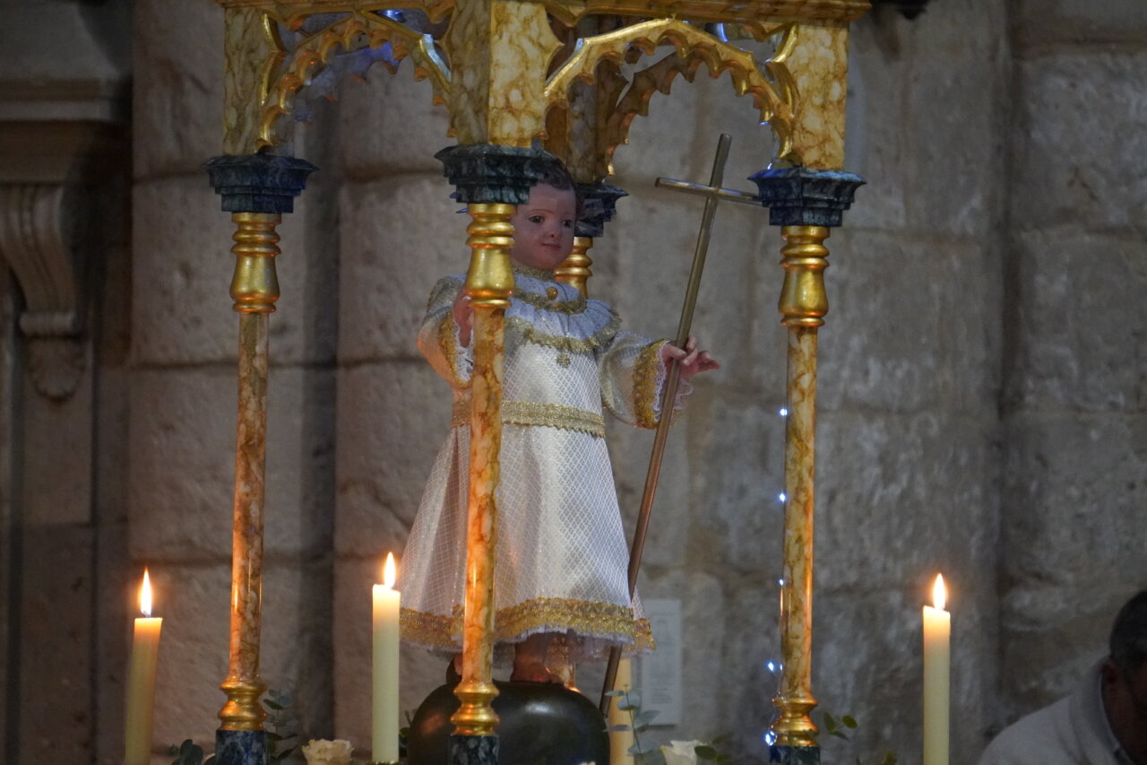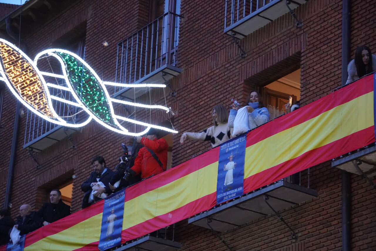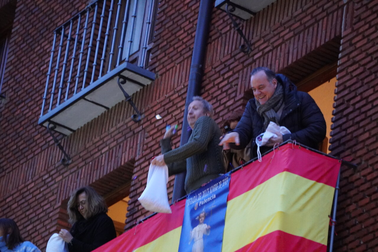 Una «pedrea» de caramelos que puso el colofón a una celebración que había comenzado con uan misa especial por la mañana y el tradicional «Rosario y renovación de las promesas del bautismo» en una abarrotada iglesia de San Miguel, a las 16:45 horas, presidido por el obispo de la Diócesis, a la que siguió la procesión dentro del templo y unos minutos fuera del mismo. Como manda la secular tradición, en el interior, encabezada por el estandarte de la Cofradía, las Hermanas y Hermanos Cofrades abrieron el paso bailando y meciendo al Niño al son del «Ea», acompañados por los dulzaineros y el coro de San Miguel, junto con el grupo de danzas “Dulce Nombre de Jesús» de la cofradía. No estuvo, esta vez, la Banda Municipal de Música de Palencia.
