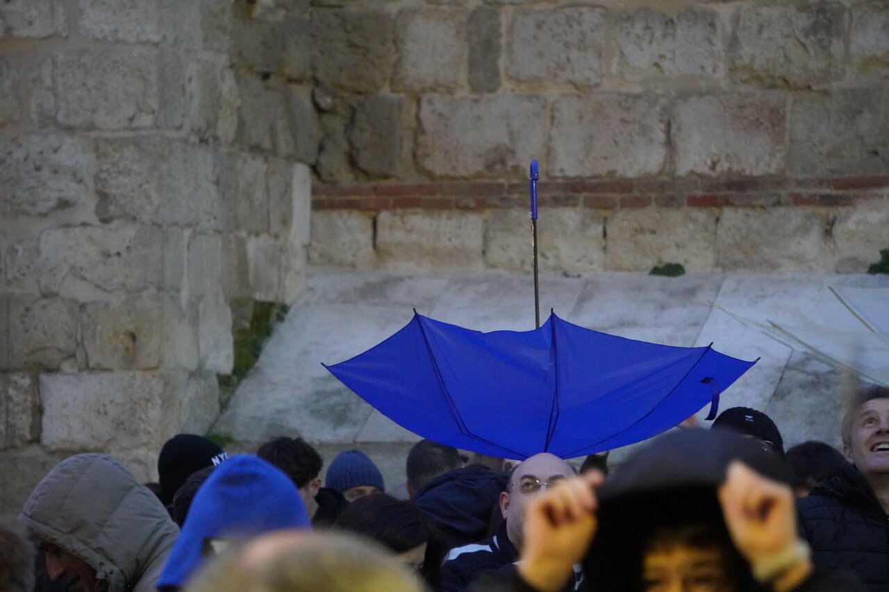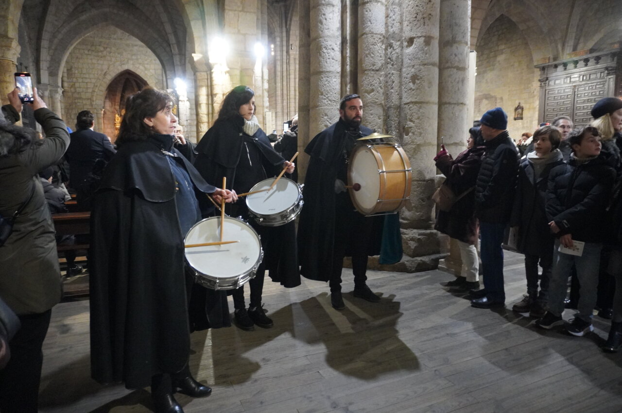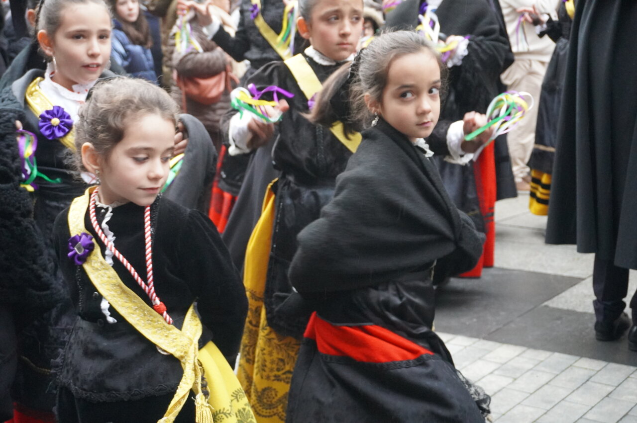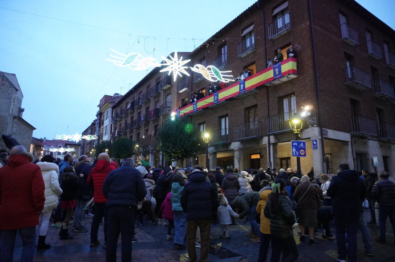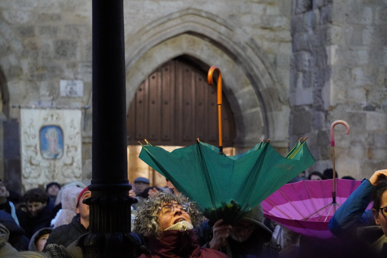 Paraguas arriba, para cantar el tradicional villancico del «Ea» y danzar a su son sin mojarse demasiado… Y un rato después, paraguas invertido, para capturar todos los caramelos posibles, que fueron lanzados desde el balcón de la casa parroquial por parte de la alcaldesa, Miriam Andrés; la presidenta de la Diputación, Ángeles Armisén; el subdelegado del Gobierno, Eduardo Santiago; el obispo de la Diócesis, Mikel Garciandía; el Hermano Mayor de la Cofradía, Carlos Mediavilla; y los concejales Antonio Casas, Orlando Castro, Víctor Torres, Domiciano Curiel y María Isabel Contreras, además del párroco de San Miguel y otros representantes de la Cofradía del Dulce Nombre de Jesús.