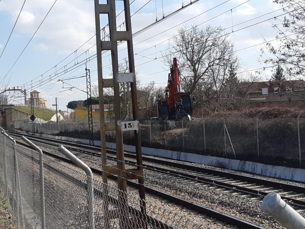 Igualmente, en el lugar donde la Cañada Real Leonesa cruzaba el ferrocarril y donde aún quedan mojones que indican el punto donde en su día los coches cruzaban a nivel la línea convencional a León, una mixta trabajaba para identificar las canalizaciones que se extienden bajo la pasarela que será derruida.