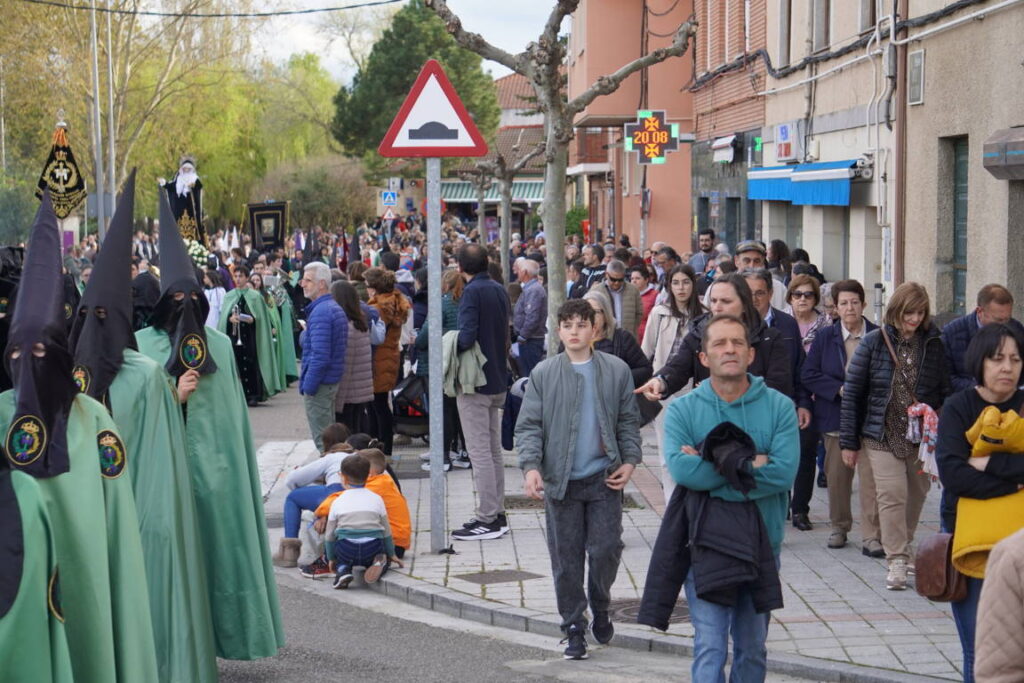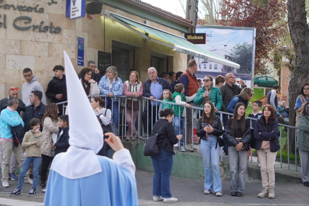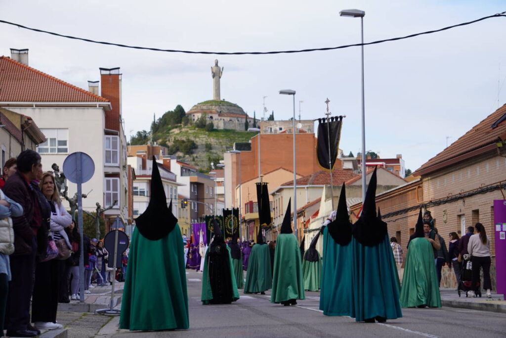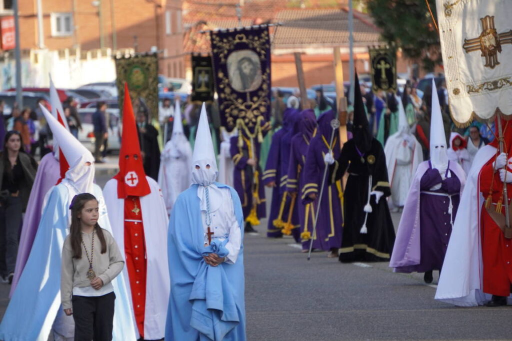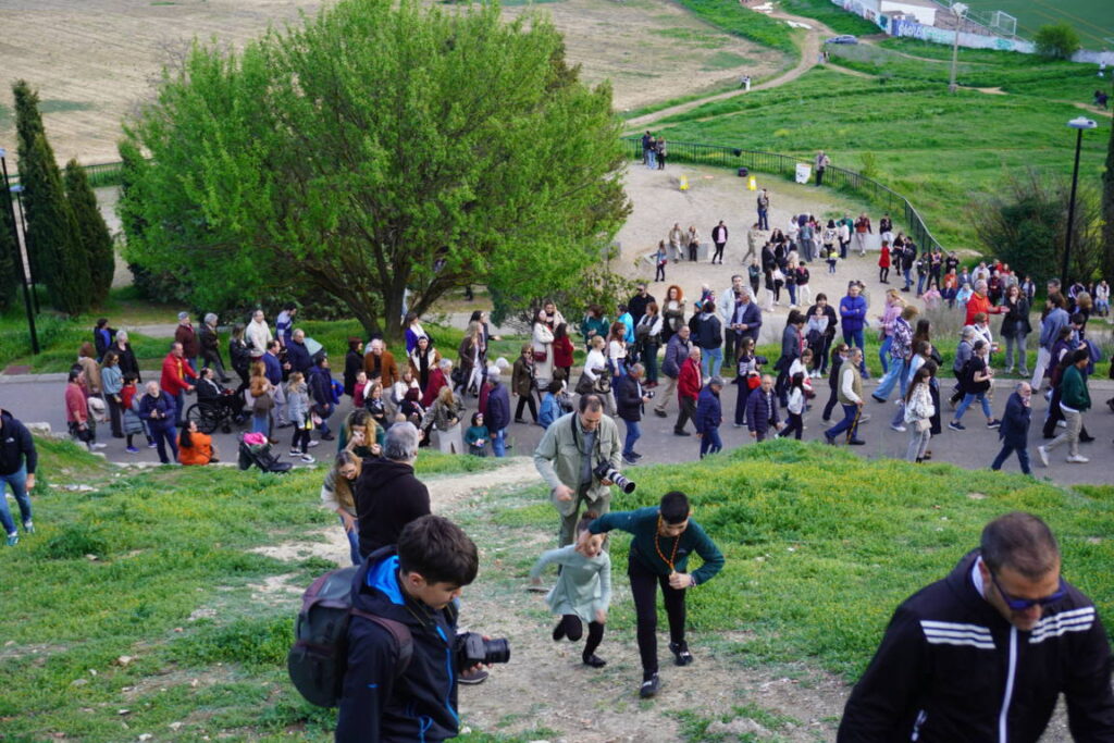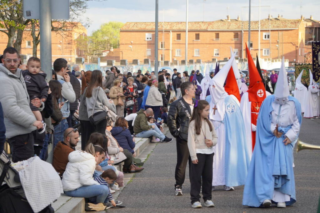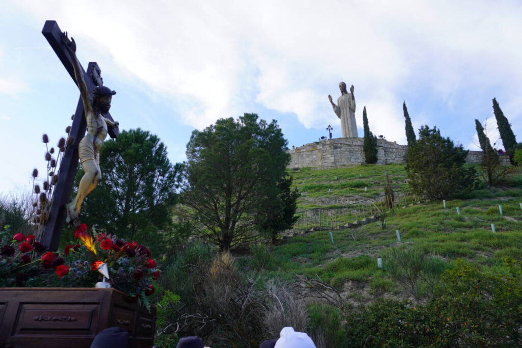 Si por la mañana las palmas ondearon bajo un cielo encapotado y con el miedo a la lluvia, la tarde trajo sol e incluso calor, aunque a lo lejos, desde el Cerro del Otero y mirando al sur, se veía cómo las nubes descargaban en algún punto. Pero no en Palencia. El cielo fue clemente con una de la procesiones más llamativas de la Semana Santa Palentina. La que llega a lo más alto de la ciudad, a los pies del Cristo del Otero: Donde tiene lugar una dase las imágenes más icónicas. Una que sólo se puede dar en Palencia. El cruce de ‘un’ Cristo, con ‘una’ Virgen a los pies del Cristo del Otero.