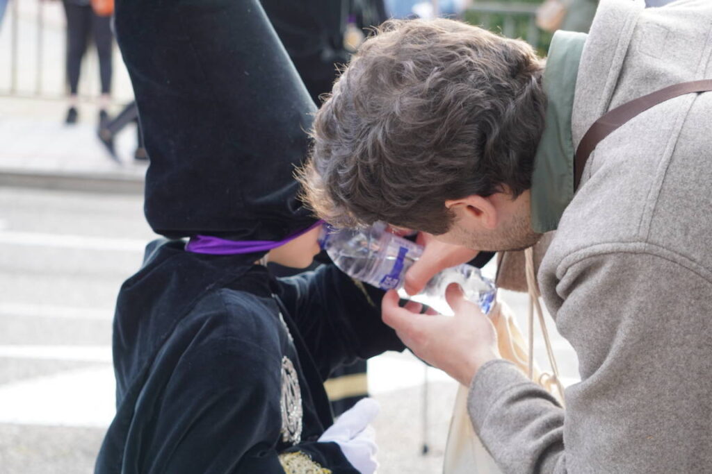 Tiempo también para recuperar fuerzas, beber agua y prepararse, los cofrades, para reemprender la marcha. “Tengo una buena noticia. Ahora es todo para abajo”, les dio ánimo uno de los cofrades a los portadores. Un punto de inflexión, una ruptura del sentimiento y la paz que se vivía allí arriba, que sirvió para volver a la Hermandad con una sonrisa haciendo más llevadera la penitencia.