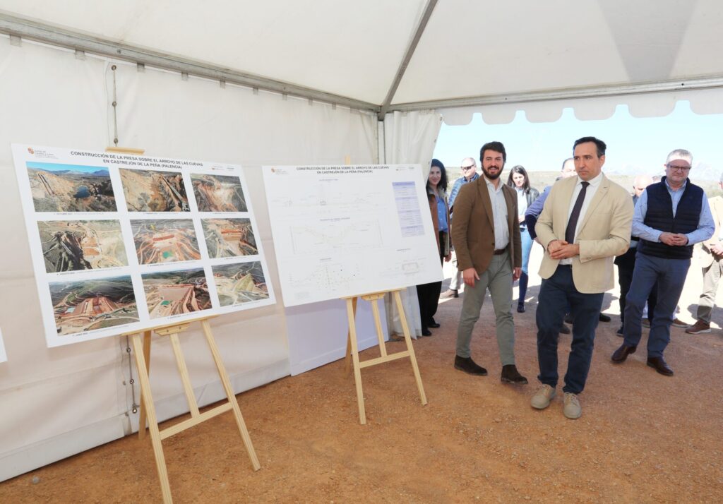 El vicepresidente de la Junta de Castilla y León, Juan García-Gallardo, acompañado del consejero de Agricultura y Ganadería, Gerardo Dueñas,visita las obras realizadas por la Junta para la finalización de la Presa de las Cuevas en Castrejón de la Peña. / Brágimo (ICAL)