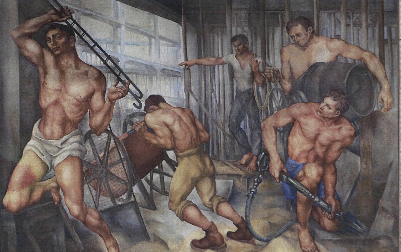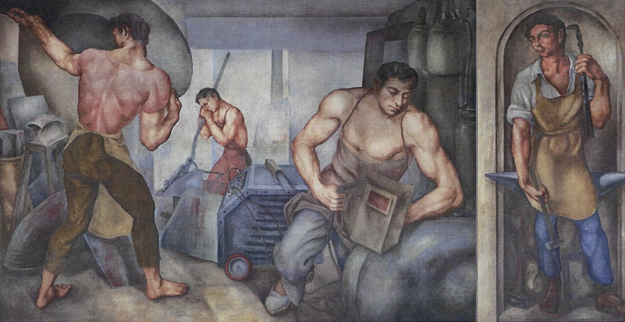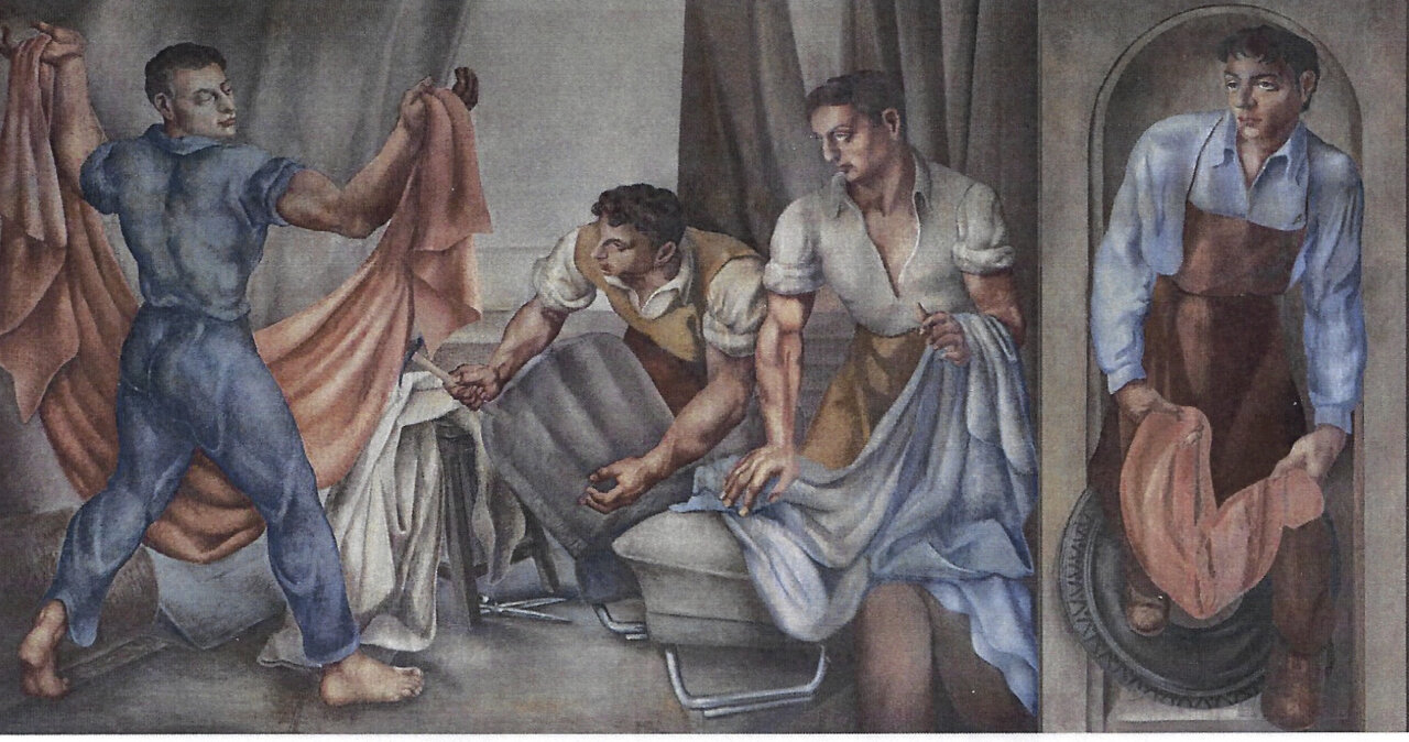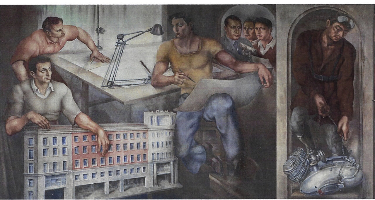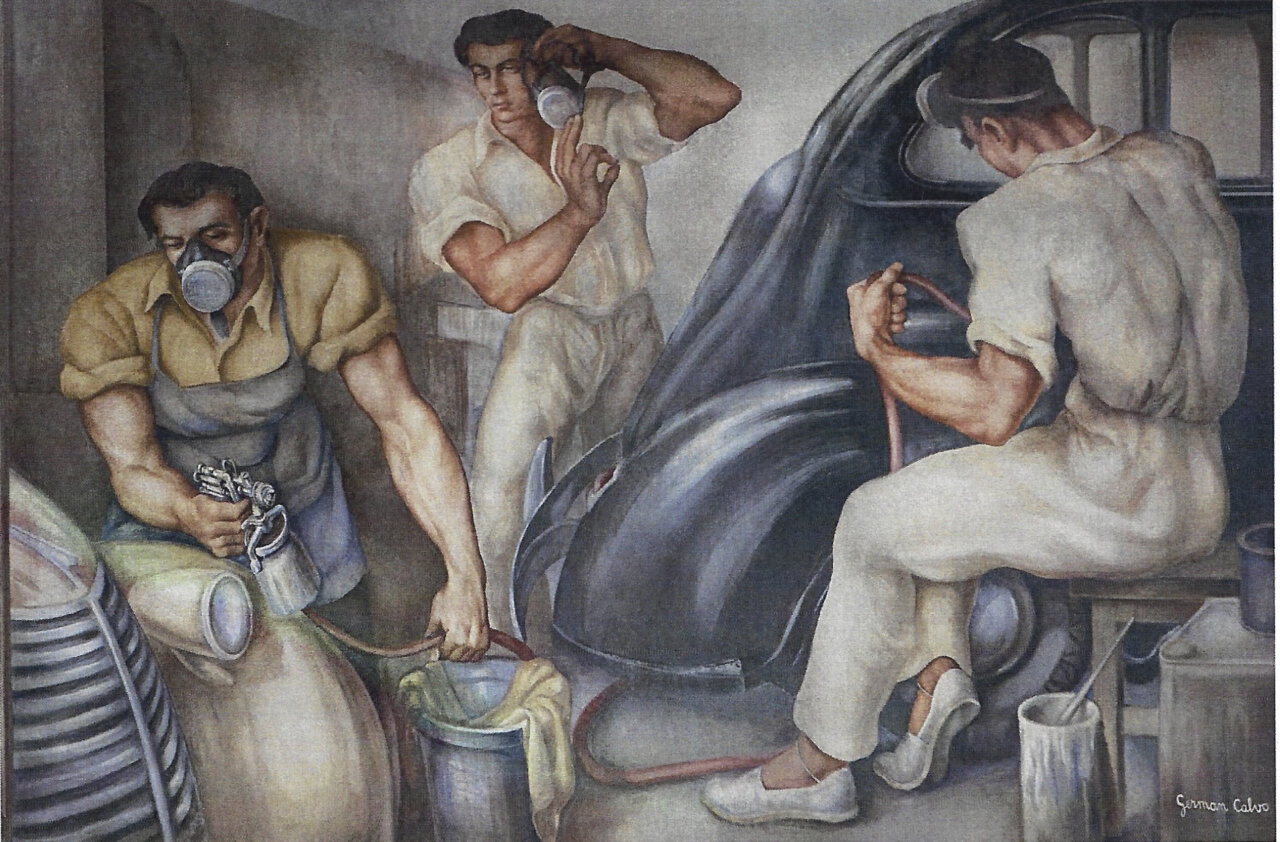Germán Calvo se presenta en el vídeo como muralista y profesor nacido en Palencia y formado en la Escuela de Bellas Artes de San Fernando. Pintado en 1951, con este mural, el pintor quiso “rendir homenaje a todos los oficios que hacen posible el mundo del automóvil”, y cita a carpinteros –“que daban forma a la madera” –, tapiceros –“que cuidaban cada detalle del interior–”, soldadores, pintores y mecánicos… “Cada escena es un reconocimiento a quienes con sus manos dieron vida a nuestra historia sobre ruedas”, señala Germán Calvo en el vídeo, que después de ofrecer la imagen del artista, refleja en movimiento las escenas en las que se divide el mural.