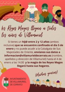 LOS REYES MAGOS LLEGARÁN A TODOS LOS NIÑOS Y NIÑAS DE VILLAMURIEL Si tienes un hijo entre 2 y 12 años (ambos inclusive) que se encuentre confinado el día 5 de enero y no puede acudir a la Cabalgata de Sus Majestades de Oriente, puedes enviar sus datos a informacion@villamurieldecerrato.es (nombre, apellidos y dirección de […]
