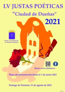 Bases de las LV Justas Poéticas «Ciudad de Dueñas». El plazo de entrega de trabajos finaliza el 1 de junio de 2021, y el acto de lectura de trabajos, fallo del jurado y entrega de premios se realizará el día 15 de agosto, cuyo contenido y formato dependerá de la situación sanitaria del momento.