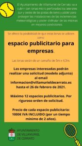 El Ayuntamiento de Villamuriel de Cerrato va a proceder a cubrir con lonas micro perforadas los laterales sur y oeste de las pistas de tenis y pádel para proteger las instalaciones de las inclemencias meteorológicas y poder disfrutar de las mismas en mejores condiciones. Por esa razón ofrecen la posibilidad de que estas lonas se […]