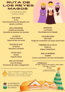 2, 3 Y 4 DE ENERO RUTA GASTRONÓMICA DE LOS REYES MAGOS De 13:00 a 23:00 h Jornadas gastronómicas navideñas por los bares de Villamuriel “La ruta de los Reyes Magos” Acude a más del 60% de los bares participantes, sella tu consumición en la tarjeta que te facilitarán los establecimientos y gana grandes premios.
