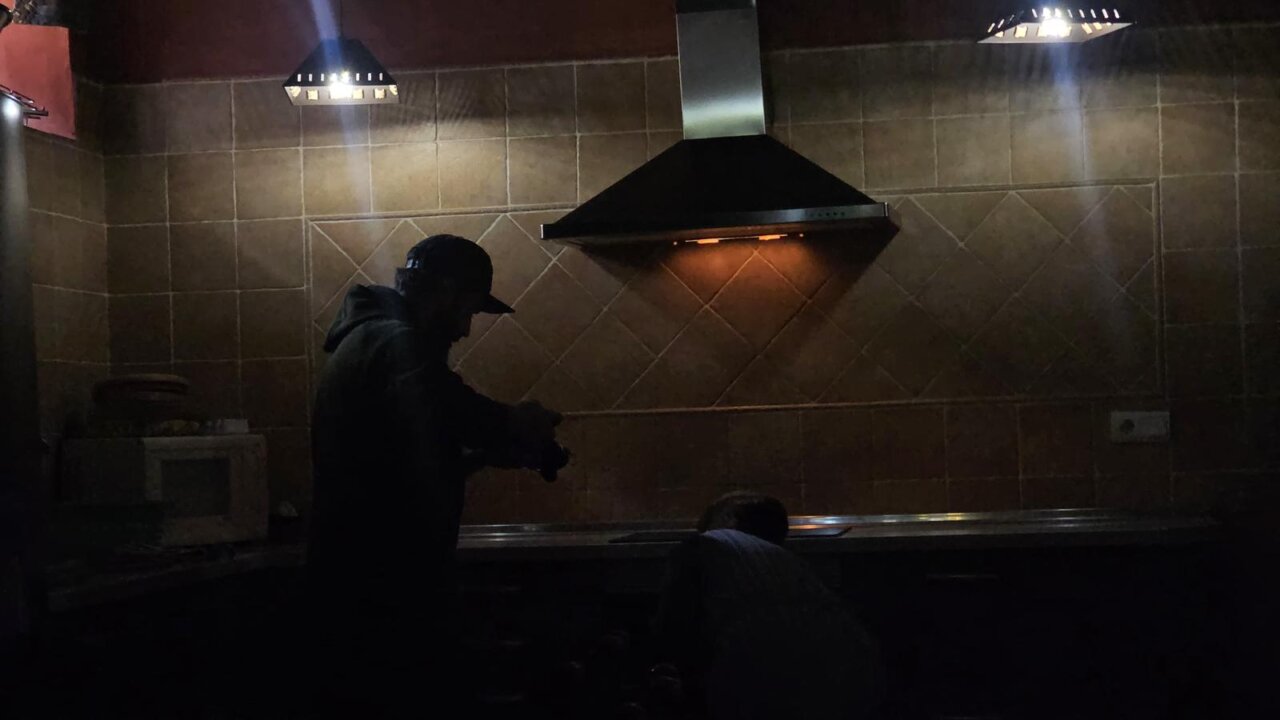 Dos personas en una cocina oscura durante un apagón navideño