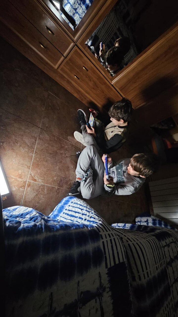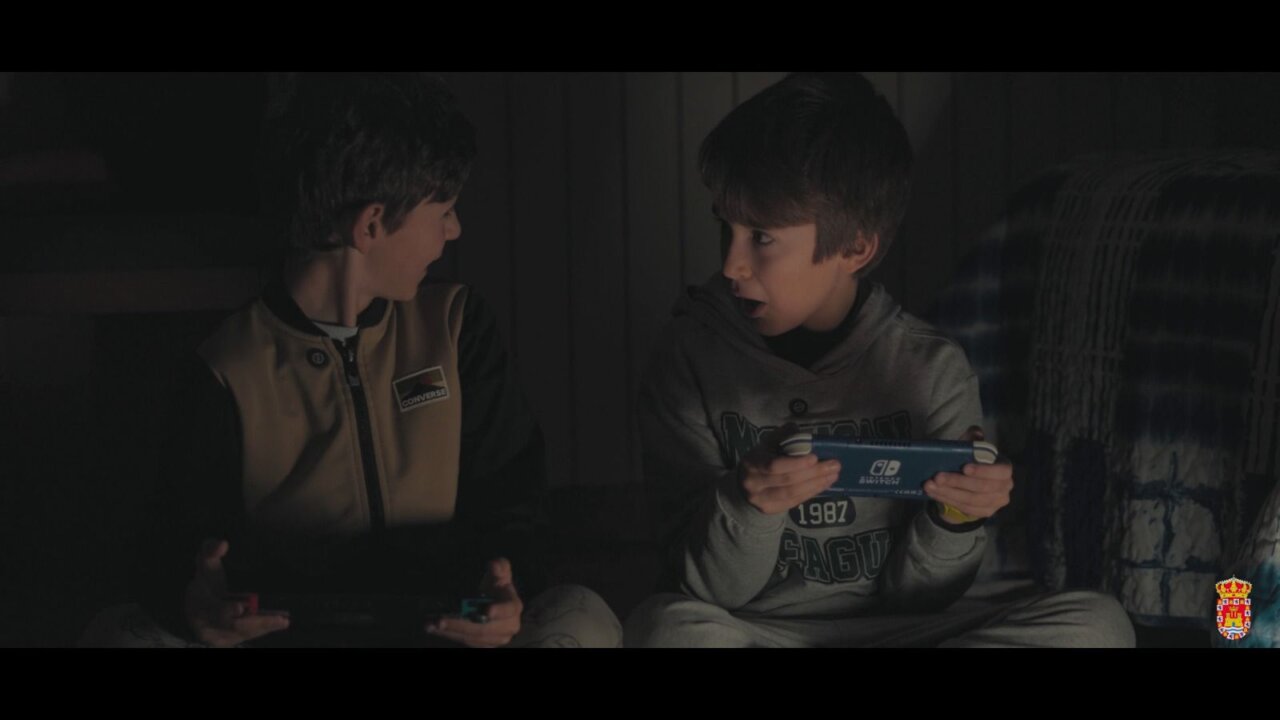 Dos niños jugando videojuegos en la oscuridad durante un apagón navideño