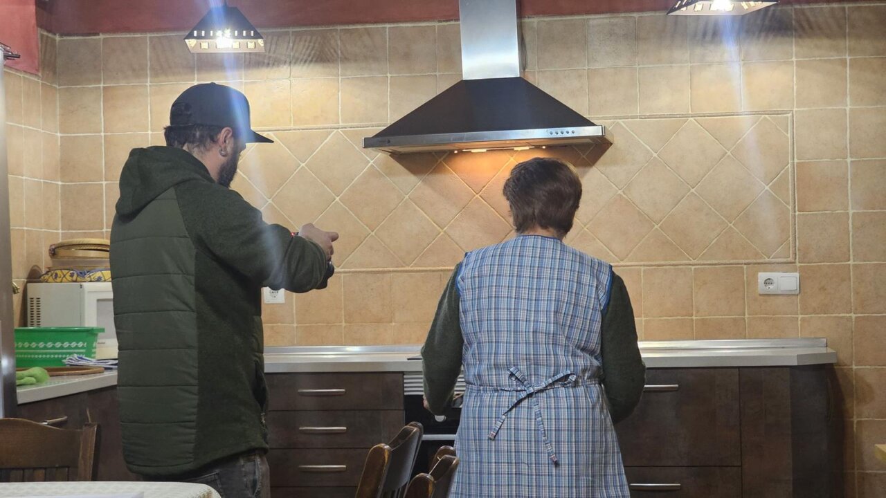 Dos personas en una cocina preparando un video navideño en Herrera de Valdecañas
