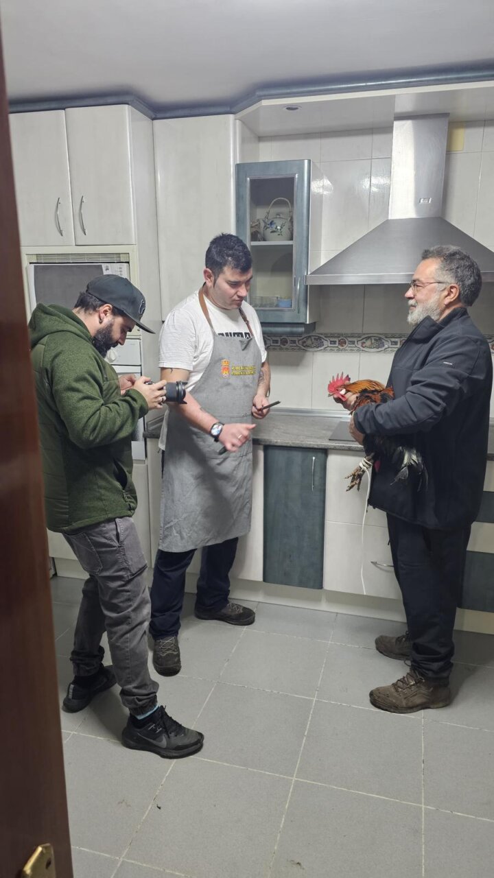 Tres personas en una cocina con un gallo y utensilios de cocina