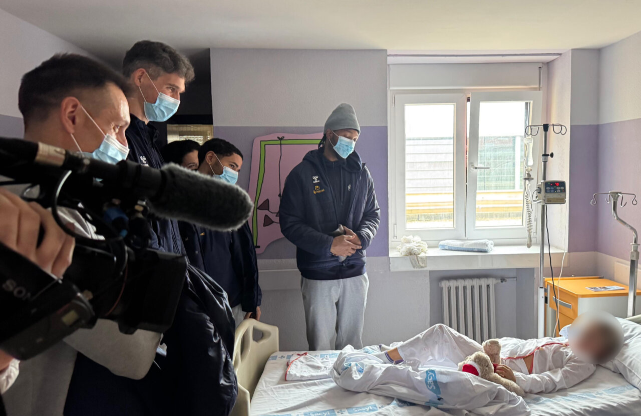 Los jugadores, junto con Natxo Lezkano y responsables del club y el equipo técnico, visitaron el Hospital de Día Oncológico, Pediatría y varias plantas de hospitalización, repartiendo peluches y ofreciendo un gesto de apoyo