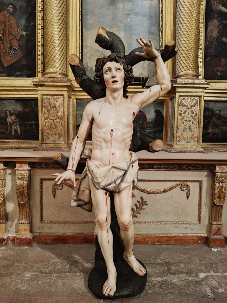 A su vez se ha realizado un tratamiento de los atributos de la imagen y de elementos removibles: se han reconstituido las plumas naturales de las flechas, se ha limpiado la corona y se ha consolidado y anclado la puntilla textil presente en el paño de pureza. La obra ha sido colocada en la hornacina central del retablo de la capilla de su nombre, su lugar de origen. Ahora se la puede contemplar y apreciar con todo el esplendor, tal y como salió del taller en el año 1637.