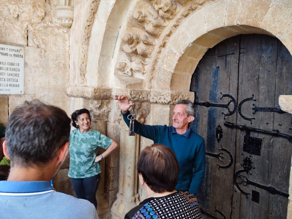 De allí fueron a Perazancas, el pueblo de Teresa, una de las residentes, y Ángela, fisioterapeuta de Tercera Actividad, donde José, custodio de la iglesia de Nuestra Señora de la Asunción, les mostró este edificio que data del siglo XII y que se abre aún con una vieja y pesada llave de forja.