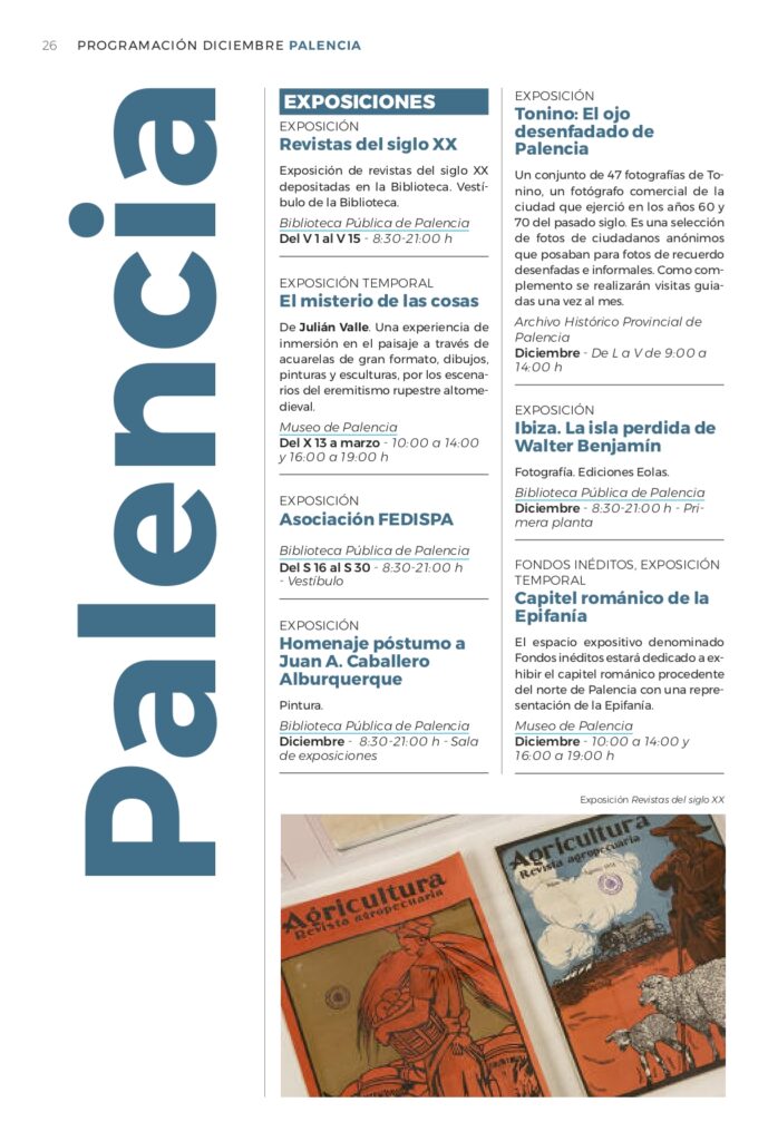 La Biblioteca Pública de Palencia albergará varias exposiciones en diciembre: ‘Revistas del siglo XX’, las pinturas del homenaje póstumo a Juan A. Caballero Alburquerque, una muestra de la Asociación FEDISPA y las fotografías de ‘Ibiza. La isla perdida de Walter Benjamín’.