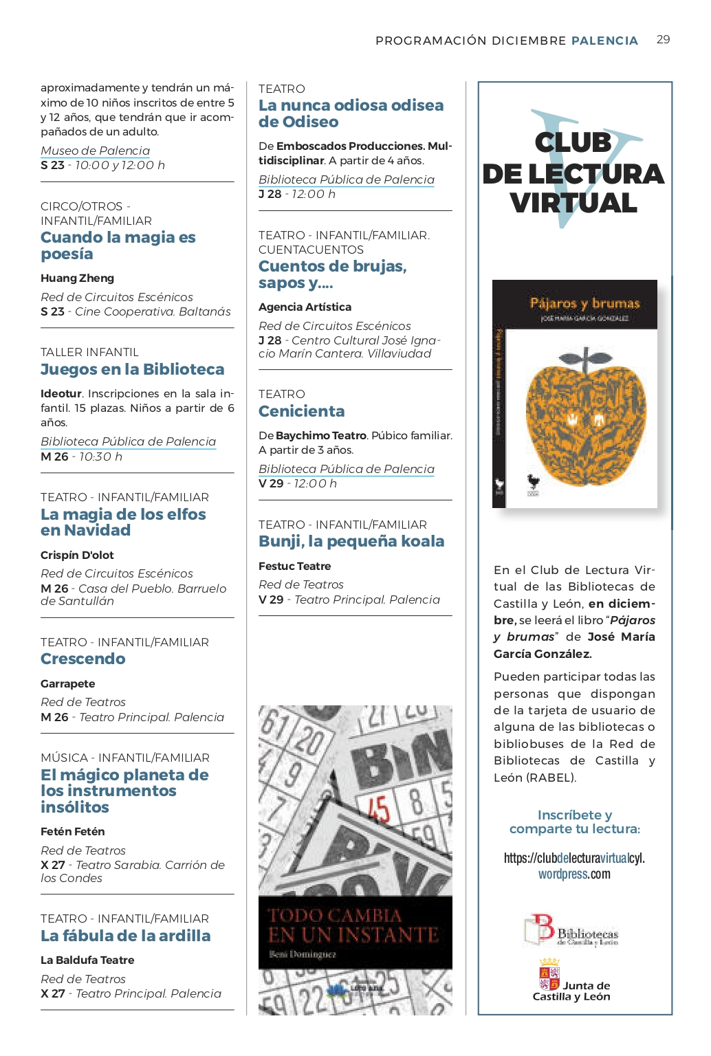 La Consejería de Cultura y Turismo ha presentado cuarenta actividades dentro de la programación cultural para el mes de noviembre en la provincia de Palencia en la red de centros culturales de la Junta de Castilla y León. El programa incluye ocho exposiciones, dos representaciones de artes escénicas, tres conciertos, tres actividades en torno a los libros, dos talleres para adultos y 18 actividades infantiles.
