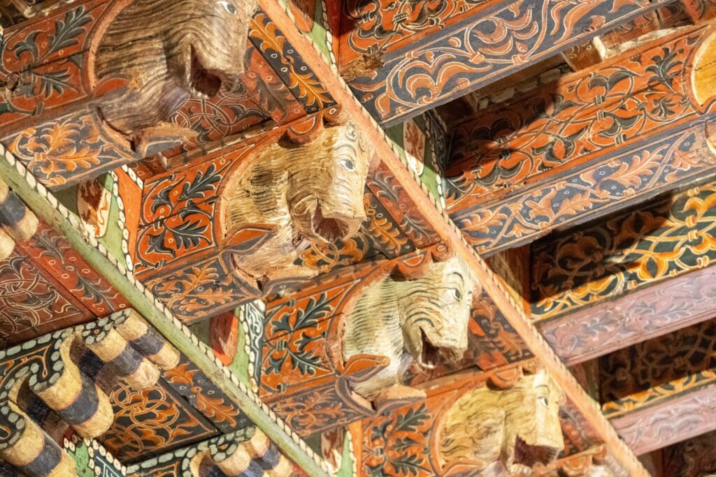 Vicente analiza que se estructura en tres niveles de canecillos: los del más bajo son de forma lobulada simple; el siguiente posee varias figuras animales, muchos de ellos fantásticos; y el último remata con rostros humanos de hombres, que como definió el profesor Lavado, unos “tienen barbas, perilla o bigote, y de mujeres, con collares y escotes”. Todo el fondo de este alfarje está salpicado de elementos decorativos vegetales y escudos alternados de Castilla y de León.