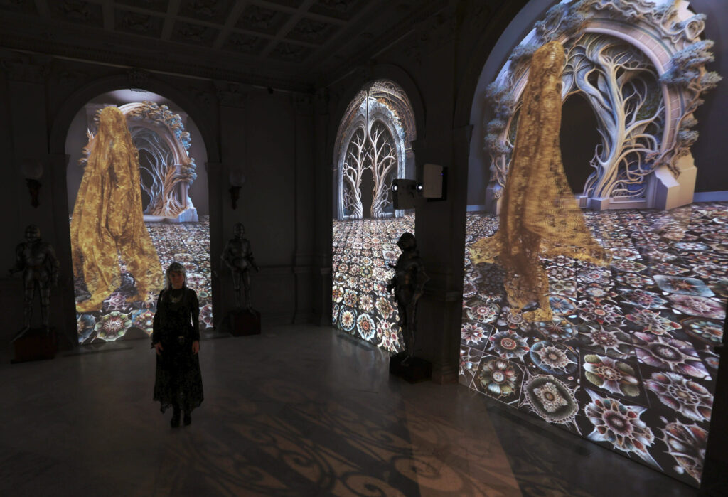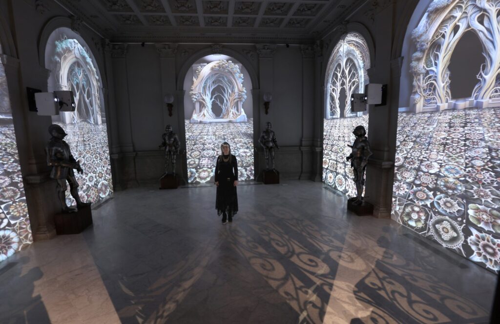 Las piezas de Marina Núñez, generadas con software 3D y utilizando “por primera vez” inteligencia artificial en algunos detalles de ciertas obras, conversan, activan las naturalezas muertas, las pinturas religiosas (fundamentalmente madonnas datadas en el tránsito del Gótico al Renacimiento), la arquitectura de principios de siglo XX de Francisco Borrás, y los restos de enfrentamientos bélicos.