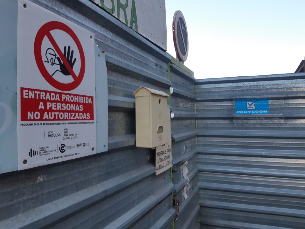 También hay vallas de obra con las pegatinas y logos de la empresa que debe tratar de terminar una obra que parece malita en Palencia. Pegatinas que se extienden también por el perímetro que rodea la obra.