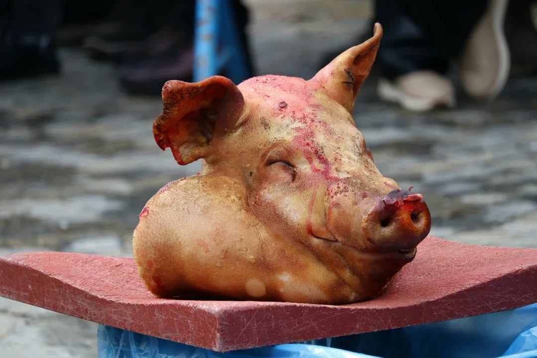 Cabeza de cerdo en la recreación de la matanza en Palencia