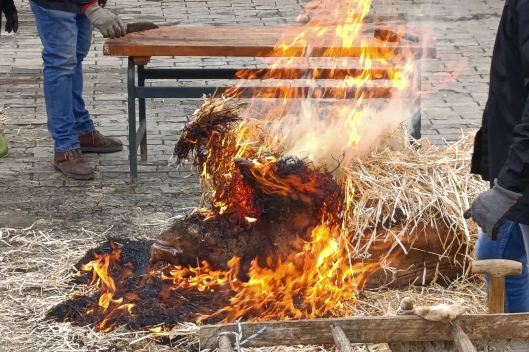 Cerdo chamuscándose durante la matanza en la Plaza Mayor de Palencia
