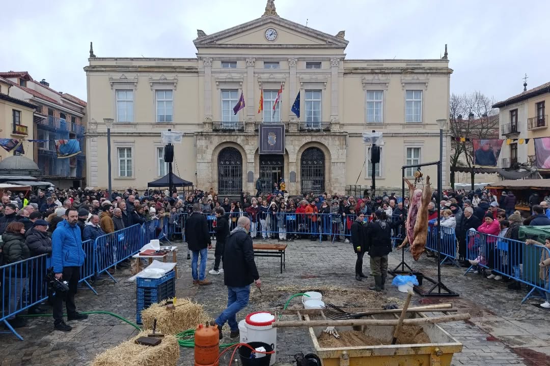 La Plaza Mayor de Palencia ha vuelto a convertirse este lunes en punto de encuentro para cientos de palentinos y palentinas con motivo de la recreación de la tradicional matanza del cerdo, una cita que un año más ha despertado una notable expectación entre pequeños y mayores y ha situado el buen yantar como eje central de la jornada.