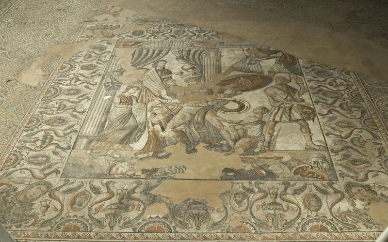 La reina Rea junto con seis princesas, entre las que está Deidamia, amante de Aquiles, acompaña al héroe en el momento en el cual Argites y Diomedes tocan las trompetas de guerra por mandato de Ulises. Por ello, Aquiles es descubierto de su disfraz de mujer, al empuñar las armas tras oír las trompetas de guerra. Rodea este bello mosaico una gran cenefa con medallas que alternan retratos masculinos y femeninos, casi todos jóvenes, realizados con teselas milimétricas, lo que ha llevado a plantear la posibilidad de que fueran retratos relacionados con la familia de Teodosio el Grande, el emperador nacido en Cauca (Coca, provincia de Segovia).