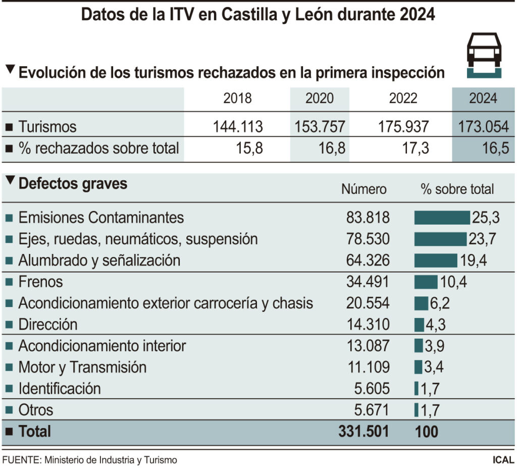 En global, sumando motocicletas, furgonetas, camiones y tractores, las emisiones contaminantes se mantiene como el segundo motivo de rechazo en las ITV de Castilla y León y representan el 20,5 por ciento de las deficiencias graves detectadas, solo por detrás de las que afectan a los sistemas de alumbrado y señalización, que continúan siendo el primer motivo, con el 21,9 por ciento de los casos.