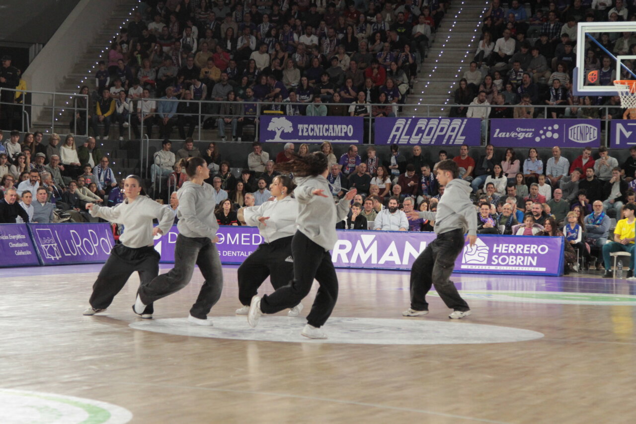 Grupo de bailarines actuando en las gradas durante un partido de baloncesto.