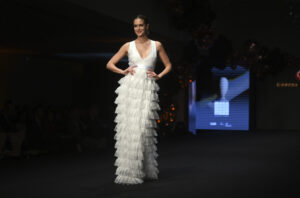 La firma Concha Ceballos fue la siguiente en desfilar, con su colección ‘Diamante’ donde se pudieron ver propuestas de novia y fiesta para temporada primavera-verano 2023. Esta colección se inspira en la belleza, la fuerza y la pureza de las líneas, tal y como explicó hoy la diseñadora, con colores blancos muy característicos de los enlaces nupciales; aunque también destacaron otros tonos como el dorado, el negro, el rojo y el verde, estos en los diseños para invitada.