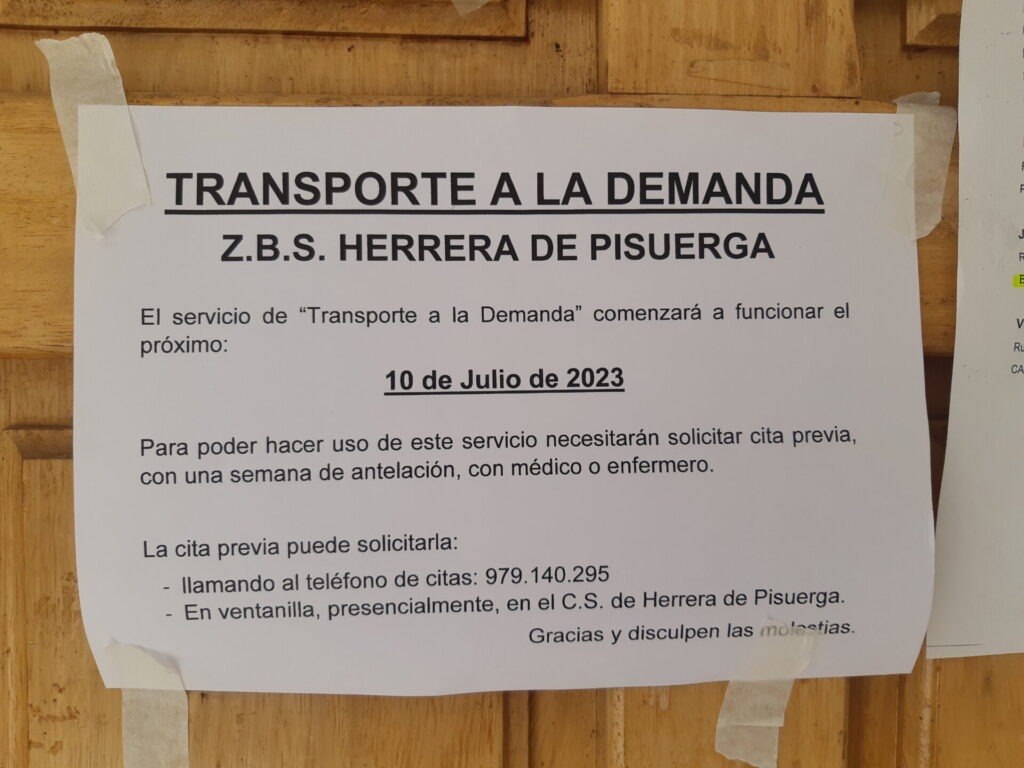 El transporte va vinculado a la cita médica, por lo que para solicitarlo, hay que llamar al Centro de Salud de Herrera de Pisuerga desde donde coordinan las citas con el transporte en taxi si es necesario por parte del paciente.