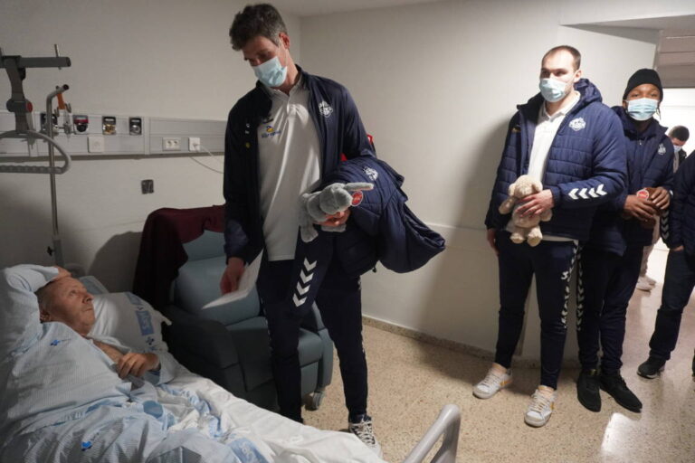 Integrantes del primer equipo de baloncesto de la ciudad y de Cruz Roja reparten en el Hospital algunos de los...