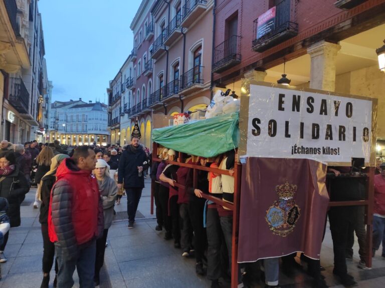 La Cofradía de la Sentencia, la única que procesiona de costal, ‘ensaya’ por la calles de Palencia recogiendo alimentos sobre...