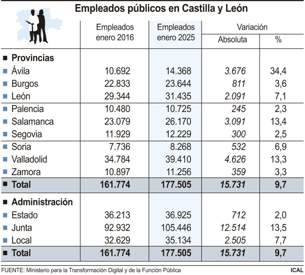 En total, Castilla y León cuenta con 177.505 trabajadores públicos. Además de los 105.446 que dependen de la Junta, 36.925 pertenecen al Estado y 35.135 a ayuntamientos y diputaciones. En comparación con 2016, el personal dependiente del Estado solo se incrementó un dos por ciento, con 712 trabajadores más, y el de las administraciones locales un 7,6 por ciento, con 2.505 más.