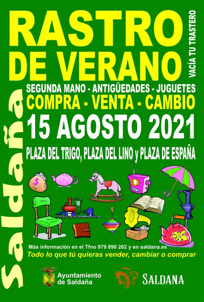 Rastro de verano. ¿Cuándo? El domingo 15 de agosto de 2021. ¿Dónde? En la Plaza del Trigo, Plaza del Lino y Plaza de España de Saldaña. Más información en el teléfono 979 890 262.