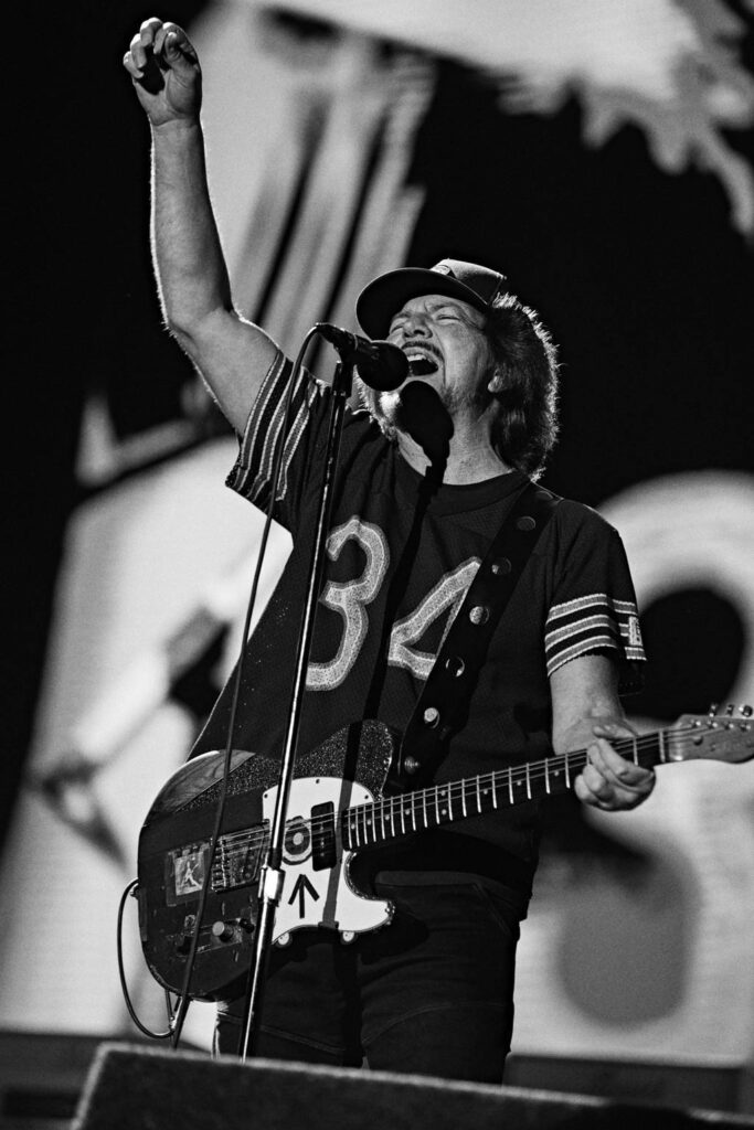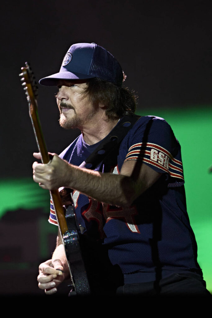 Un Eddie Vedder con muchas ganas de conectar con los allí congregados en la capital de España, sacó al escenario unos apuntes en castellano de lo que quería contarnos para que todos pudiéramos entenderle. Sin duda un gran esfuerzo que valoró mucho el respetable que abarrotaba el escenario para ver una banda compacta, sobrada de calidad y arte, con un virtuosismo único en los instrumentos y un set list cargado de grandes himnos generacionales para los nacidos en los 70 y 80.