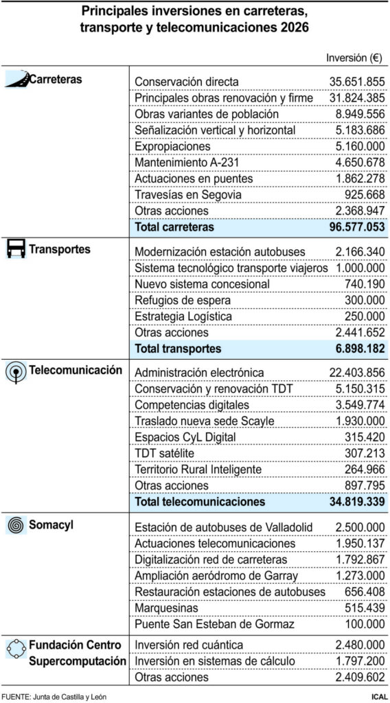 El proyecto de ley de Presupuestos Generales de la Comunidad para 2026, registrado hoy en las Cortes y consultado por Ical, contempla unas inversiones totales de 139,3 millones para el departamento de José Luis Sanz Merino, a los que se unen los 6,68 millones de la Fundación del Centro de Supercomputación y otros ocho a través de Somacyl (Sociedad Pública de Infraestructuras y Medio Ambiente).