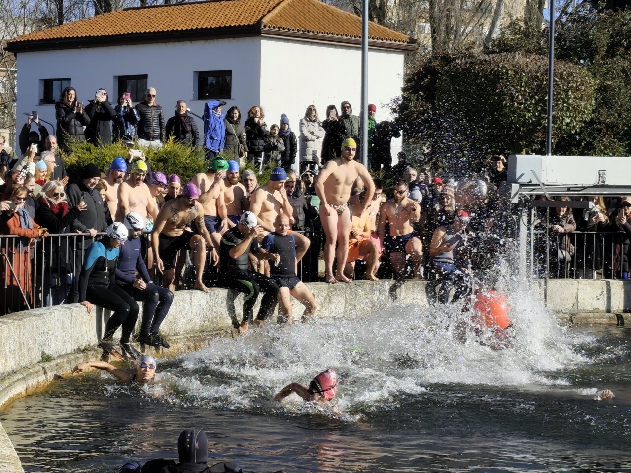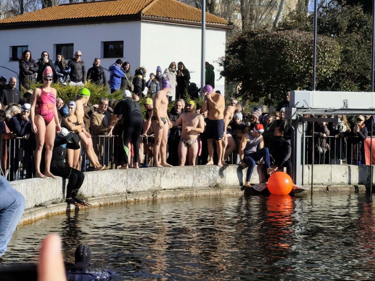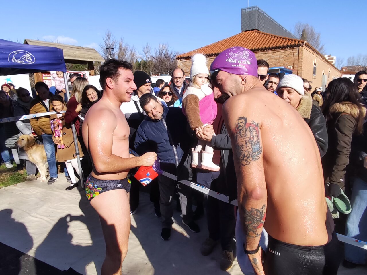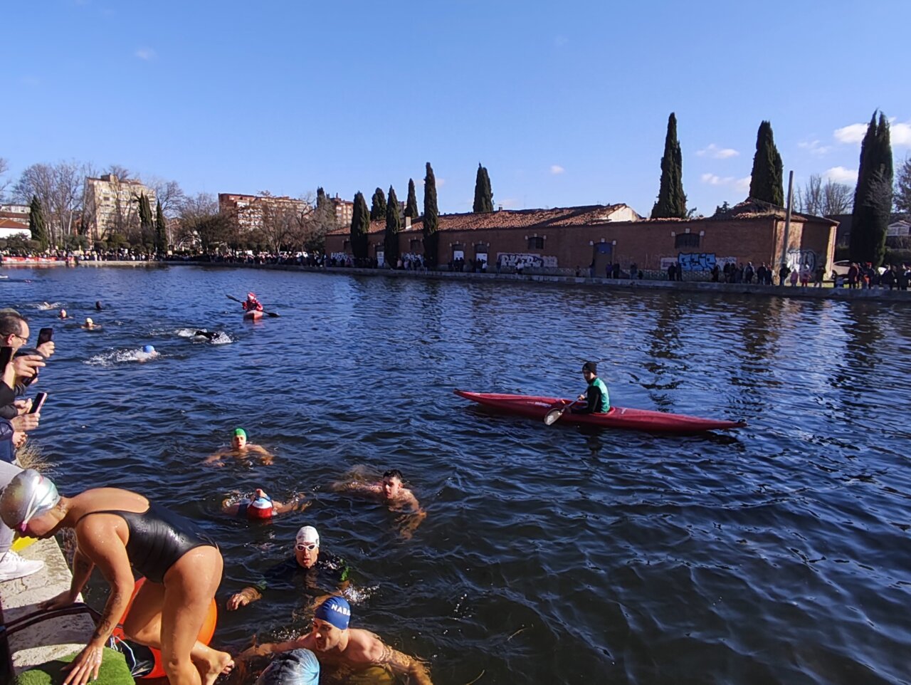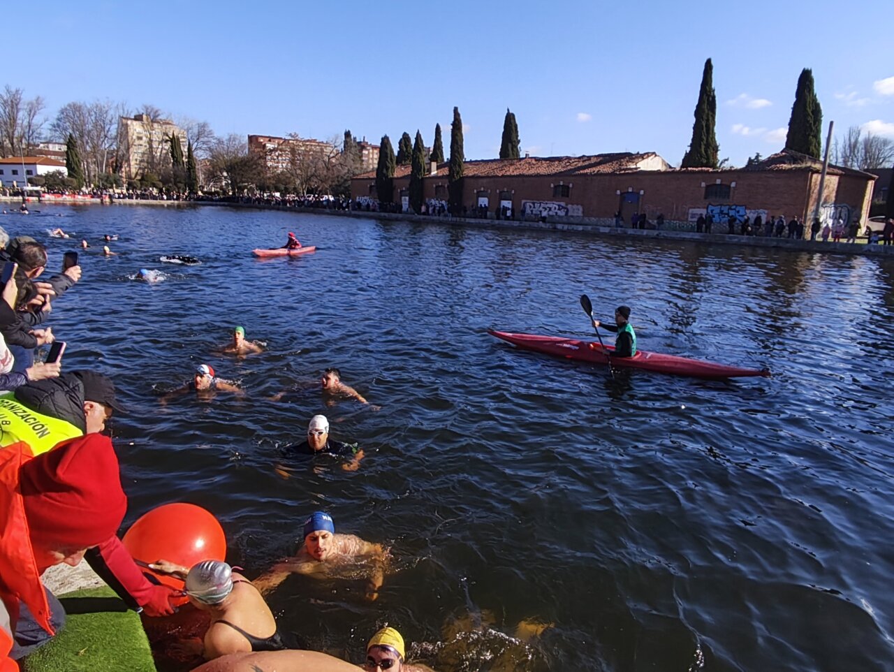 Unos 3 o 4 grados en el ambiente. Parecido en las poco luminosas aguas de la Dársena del Canal de Castilla y Palencia. A pocos de los presentes hoy desde las 12 horas en los entornos del Museo del Agua se les ocurría ir sin abrigo o sin gorro. Pero otros, una treintena, llevaban poco más que un gorro, un traje de neopreno y los más valientes, un bañador mondo y lirondo.