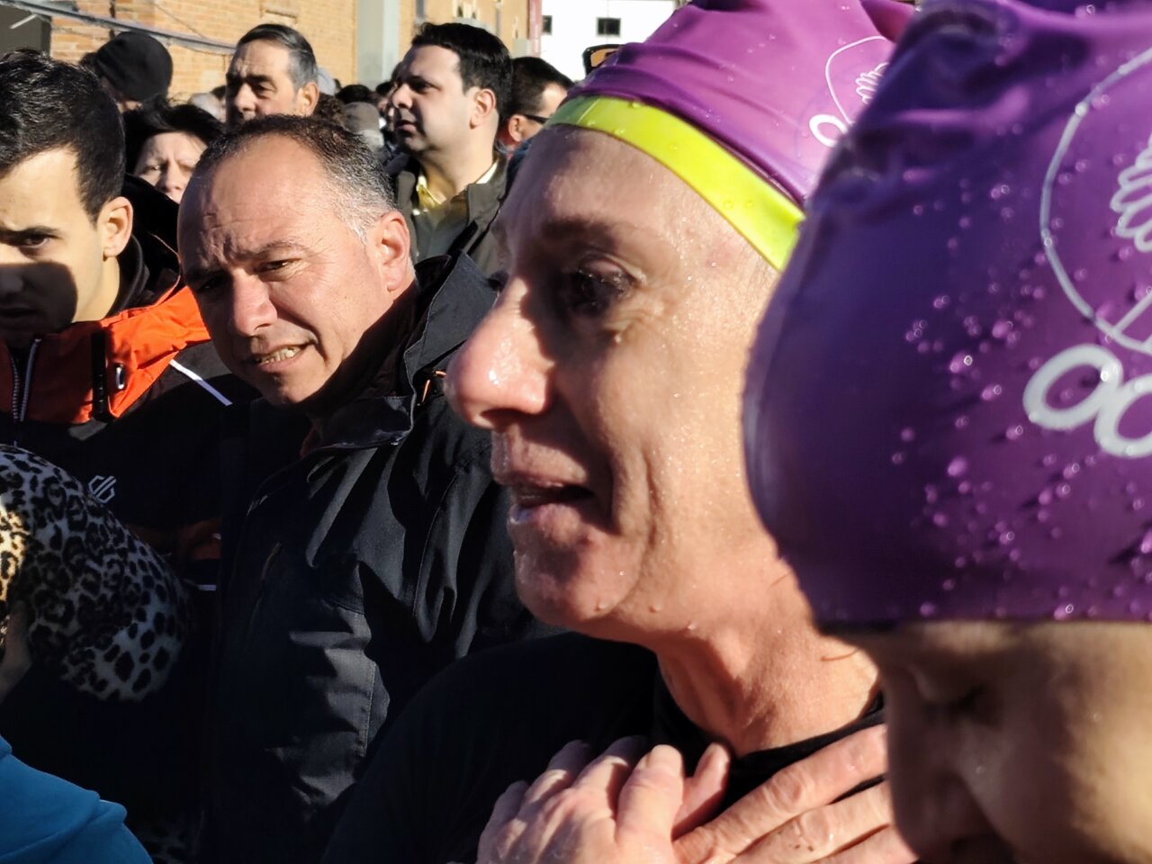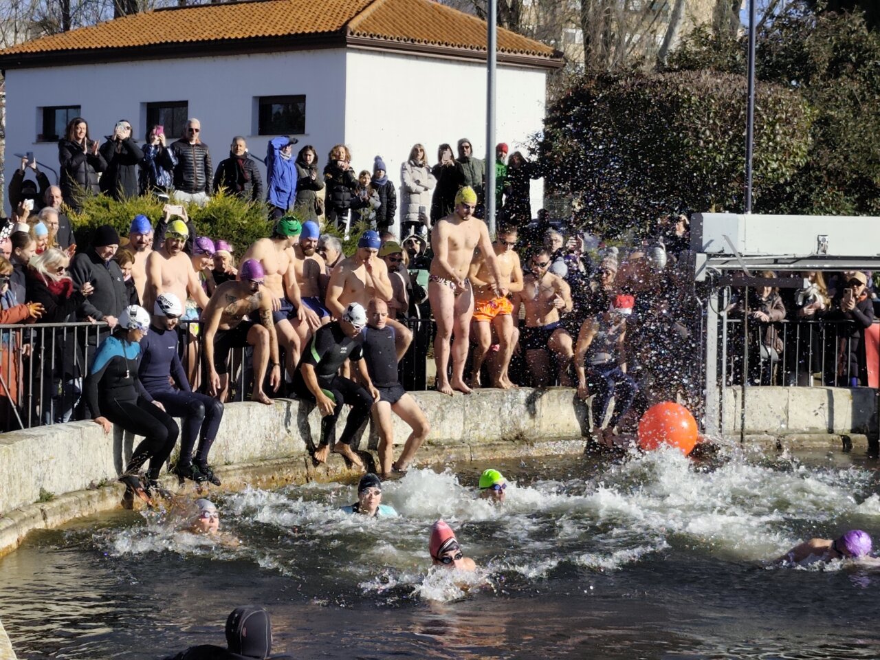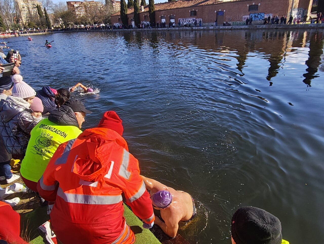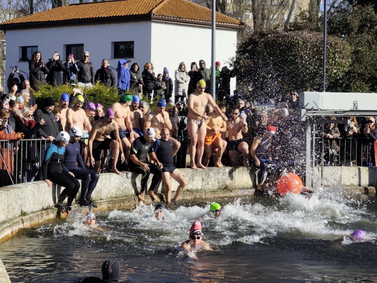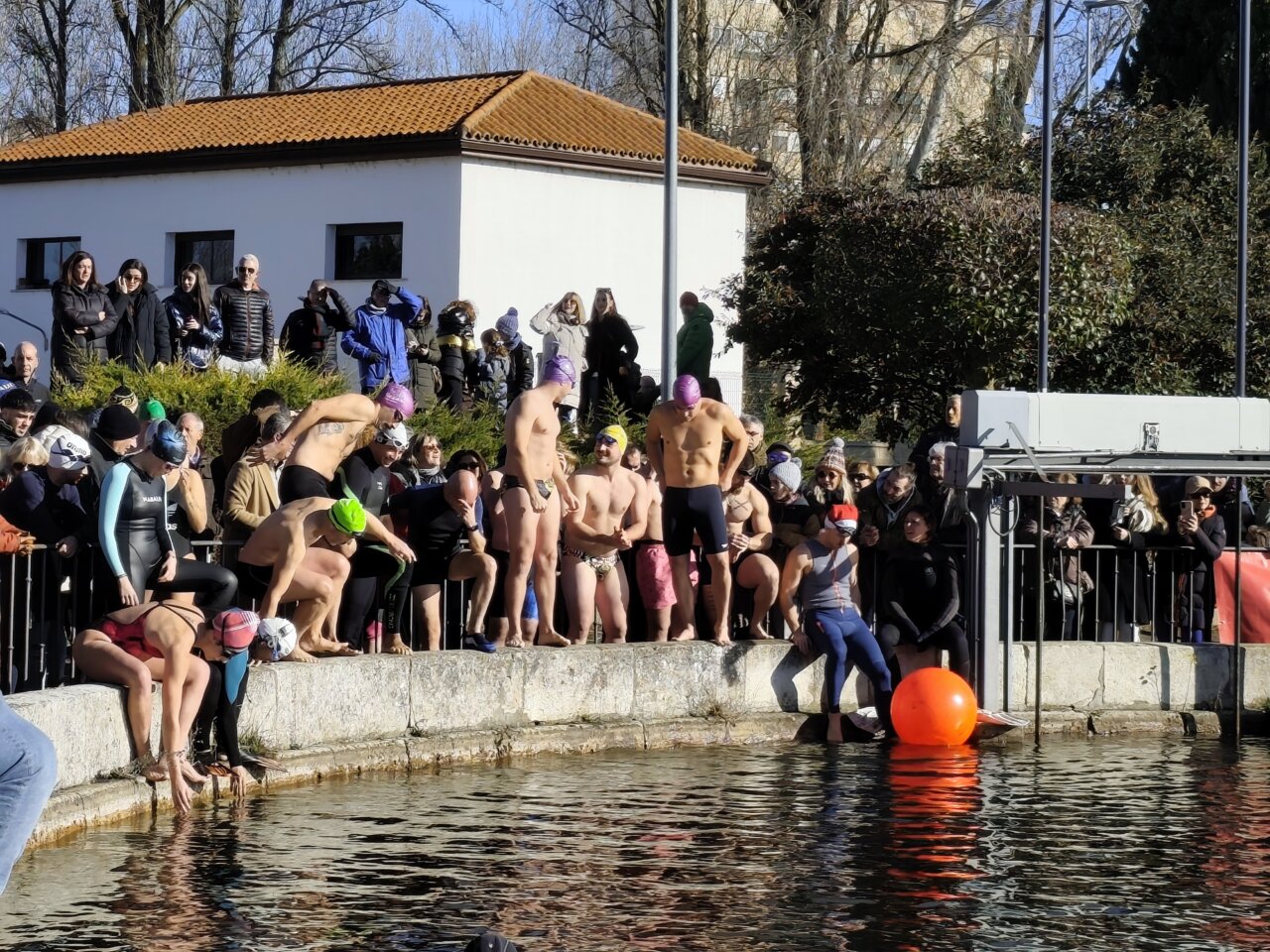 Unos 3 o 4 grados en el ambiente. Parecido en las poco luminosas aguas de la Dársena del Canal de Castilla y Palencia. A pocos de los presentes hoy desde las 12 horas en los entornos del Museo del Agua se les ocurría ir sin abrigo o sin gorro. Pero otros, una treintena, llevaban poco más que un gorro, un traje de neopreno y los más valientes, un bañador mondo y lirondo.