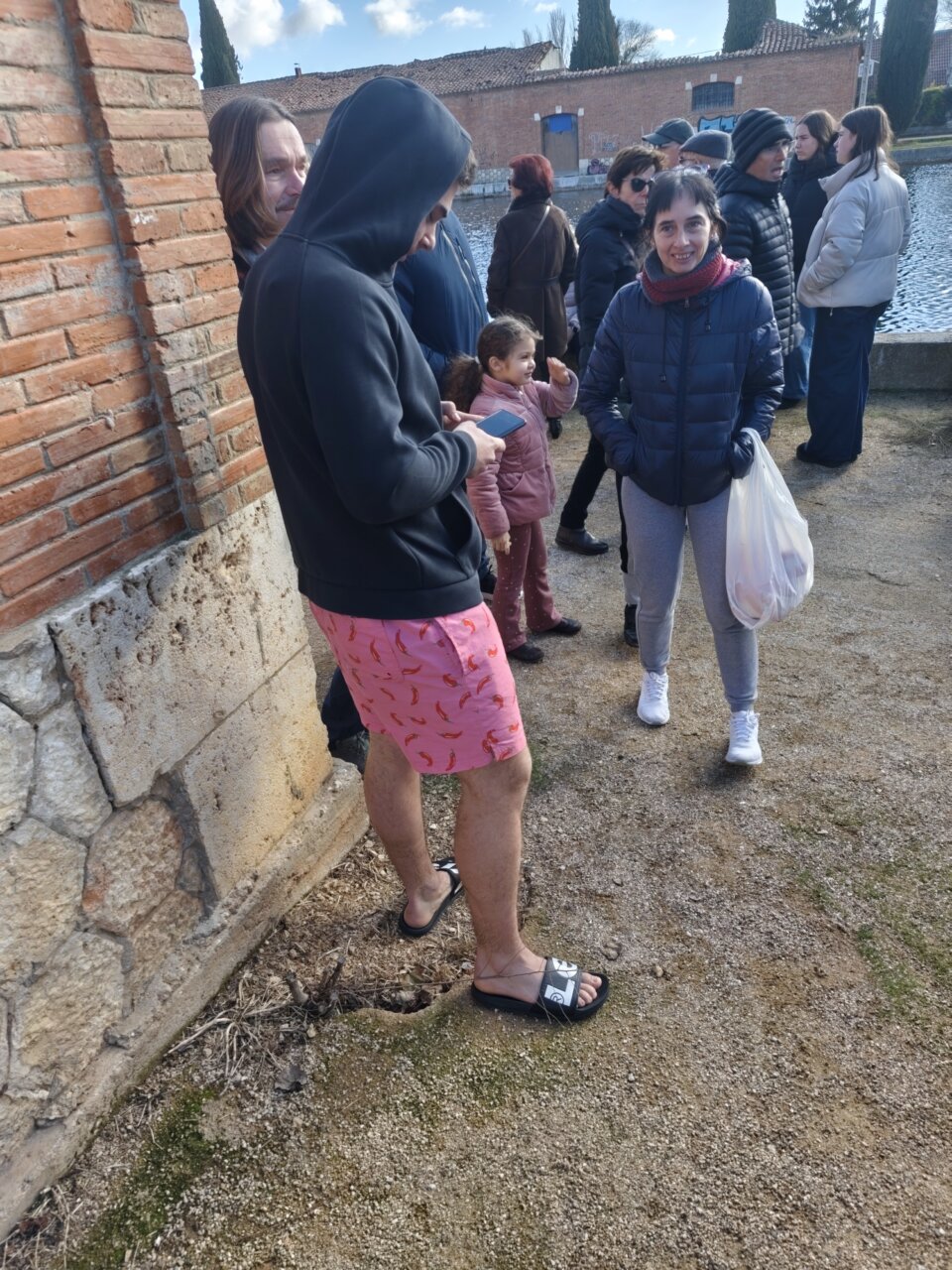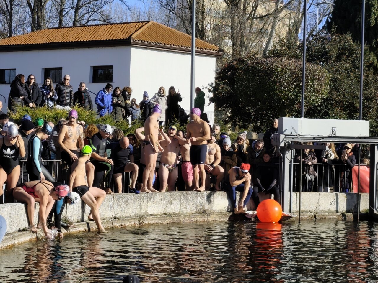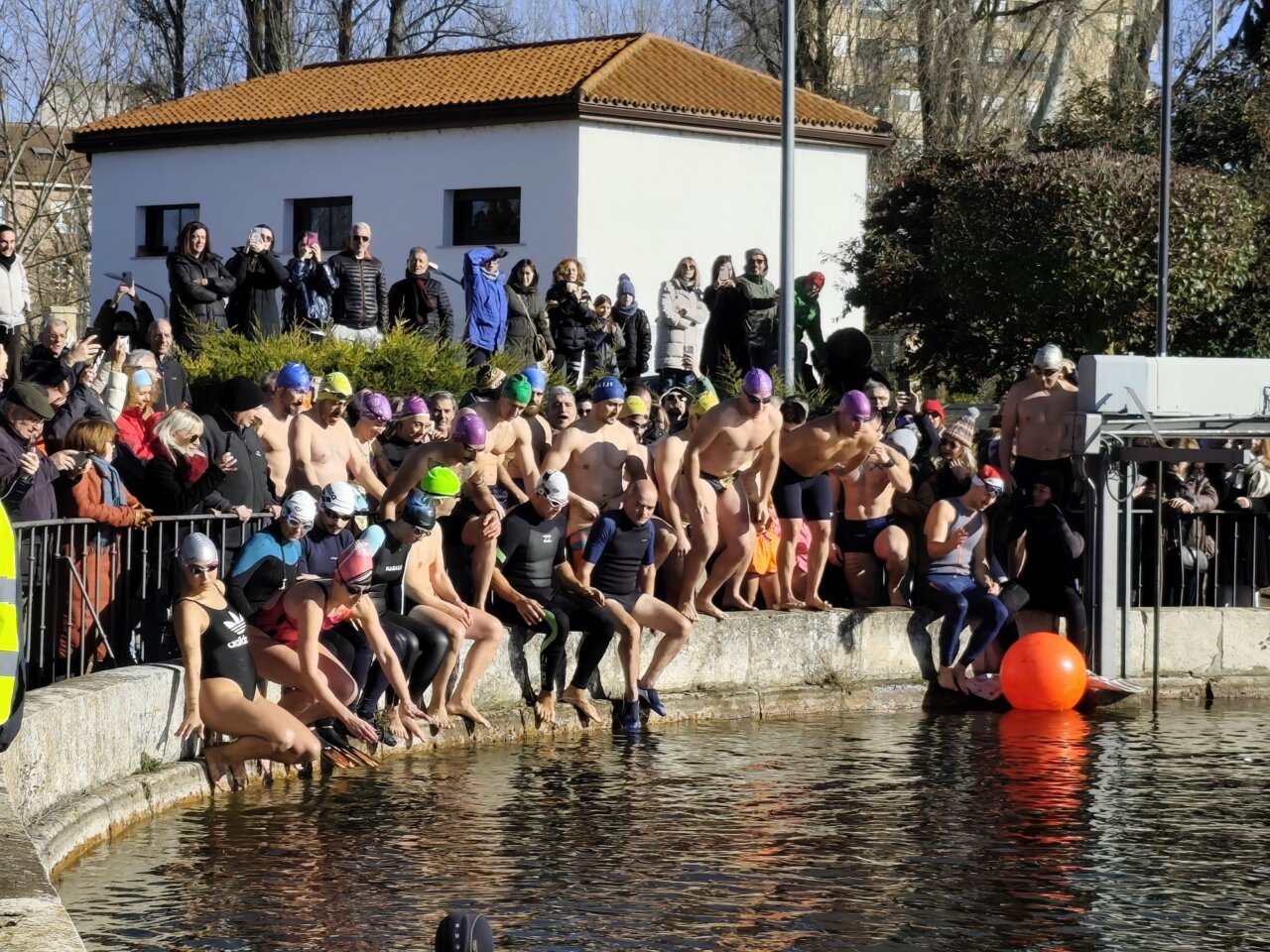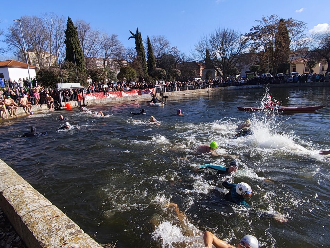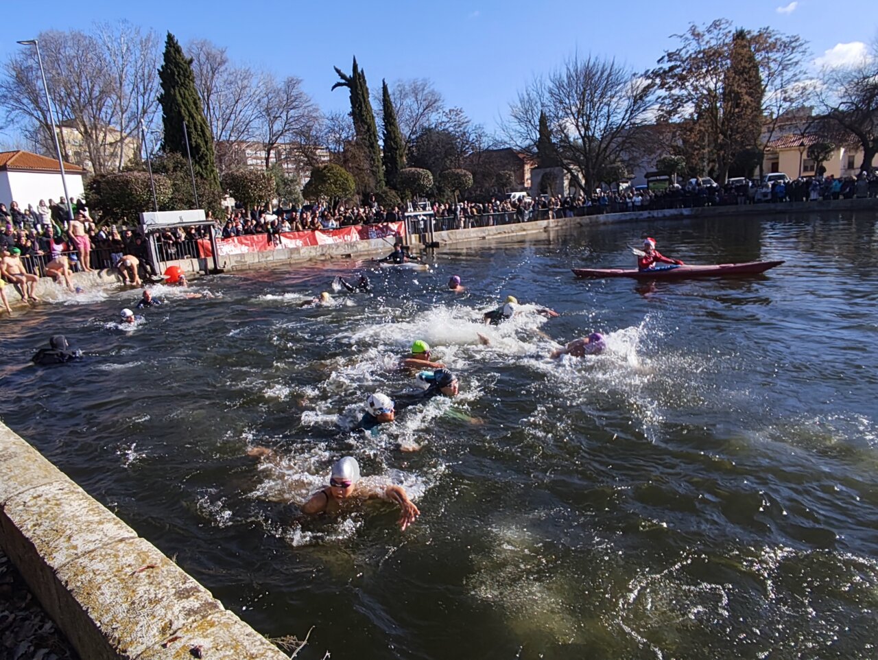 Unos 3 o 4 grados en el ambiente. Parecido en las poco luminosas aguas de la Dársena del Canal de Castilla y Palencia. A pocos de los presentes hoy desde las 12 horas en los entornos del Museo del Agua se les ocurría ir sin abrigo o sin gorro. Pero otros, una treintena, llevaban poco más que un gorro, un traje de neopreno y los más valientes, un bañador mondo y lirondo.