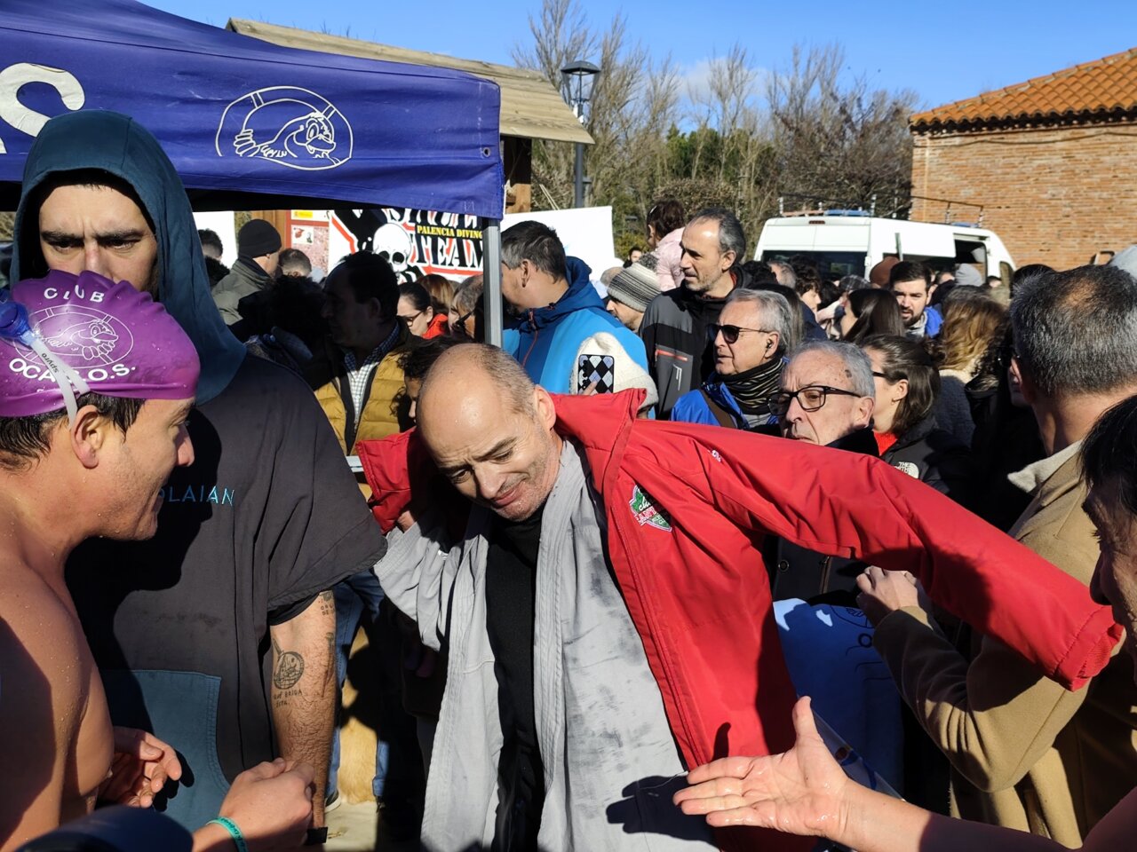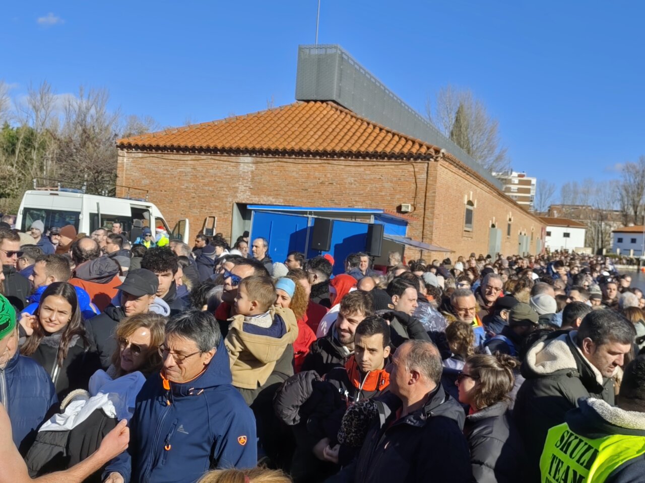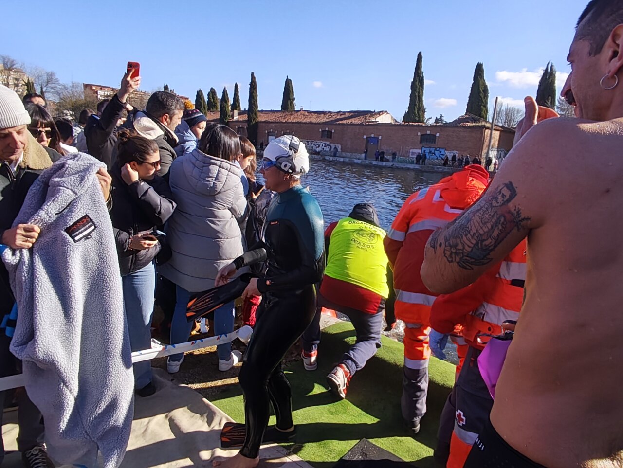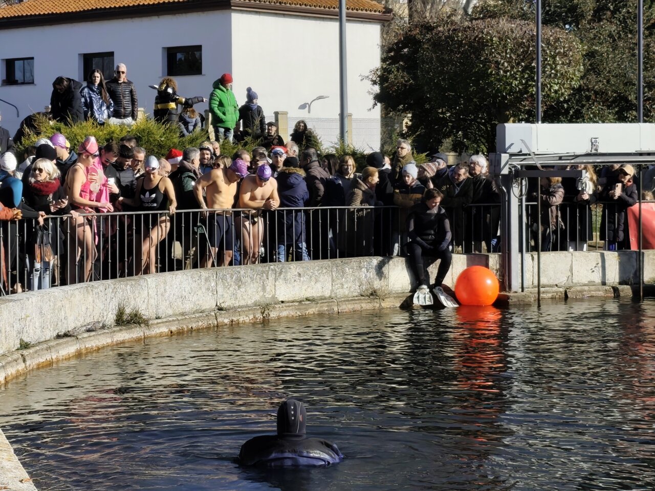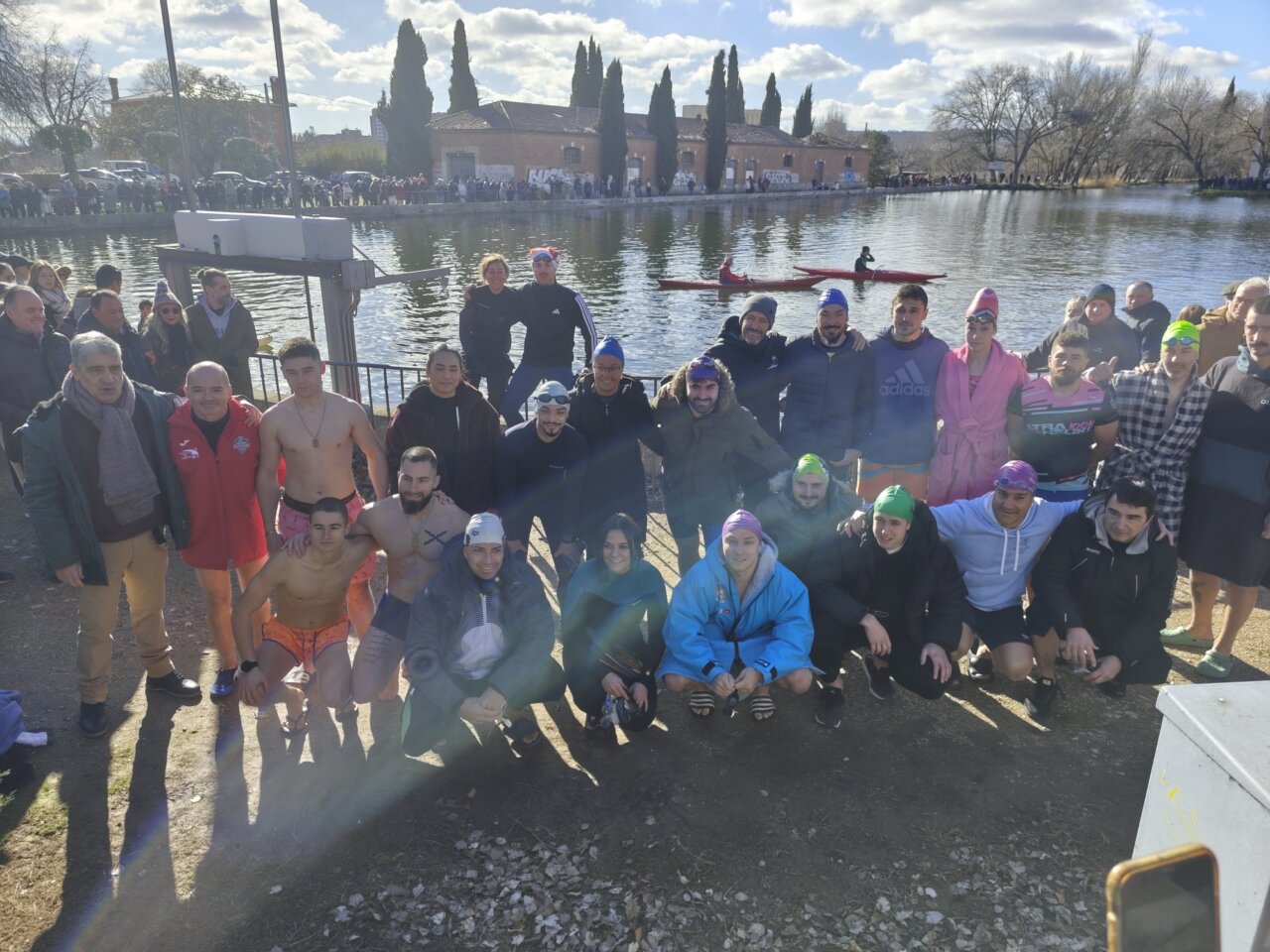 Unos 3 o 4 grados en el ambiente. Parecido en las poco luminosas aguas de la Dársena del Canal de Castilla y Palencia. A pocos de los presentes hoy desde las 12 horas en los entornos del Museo del Agua se les ocurría ir sin abrigo o sin gorro. Pero otros, una treintena, llevaban poco más que un gorro, un traje de neopreno y los más valientes, un bañador mondo y lirondo.