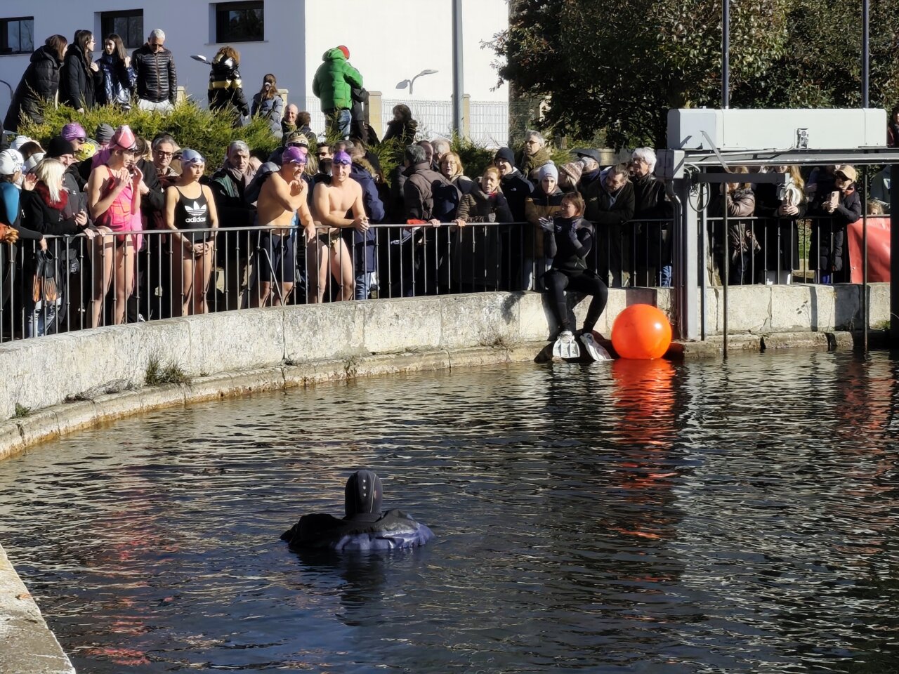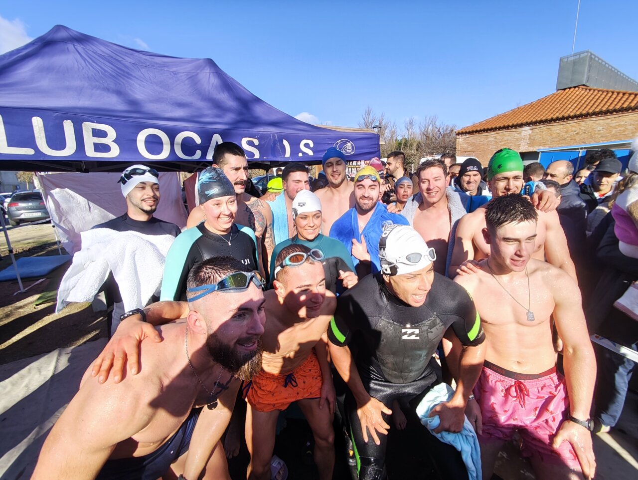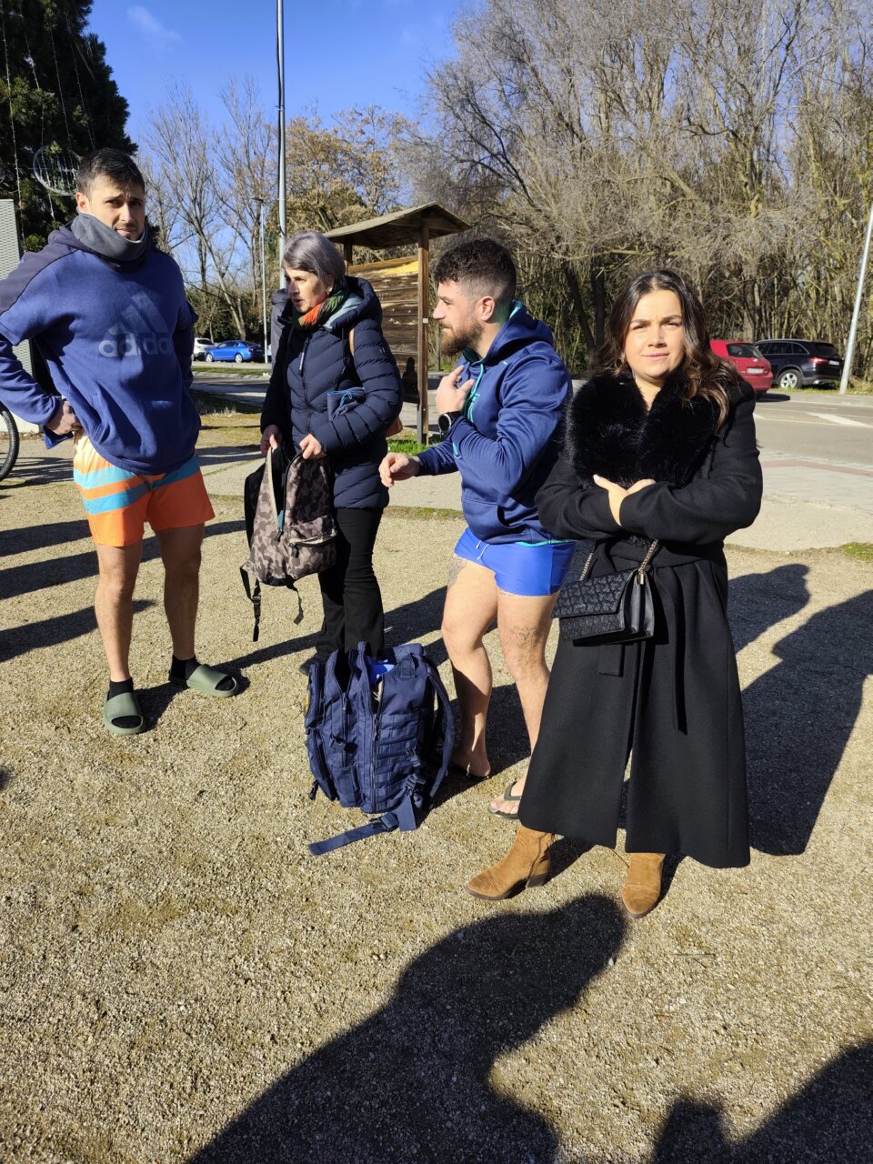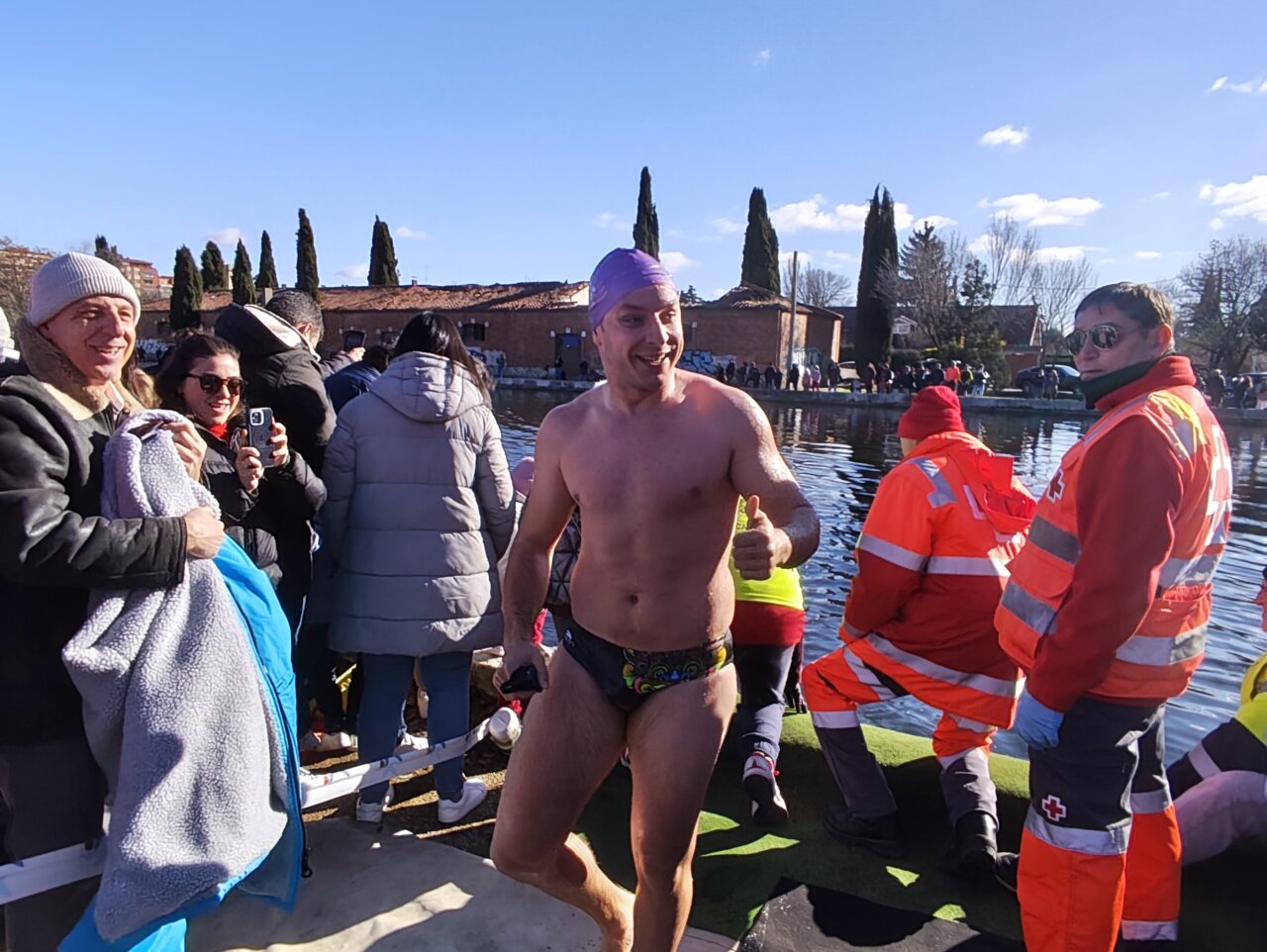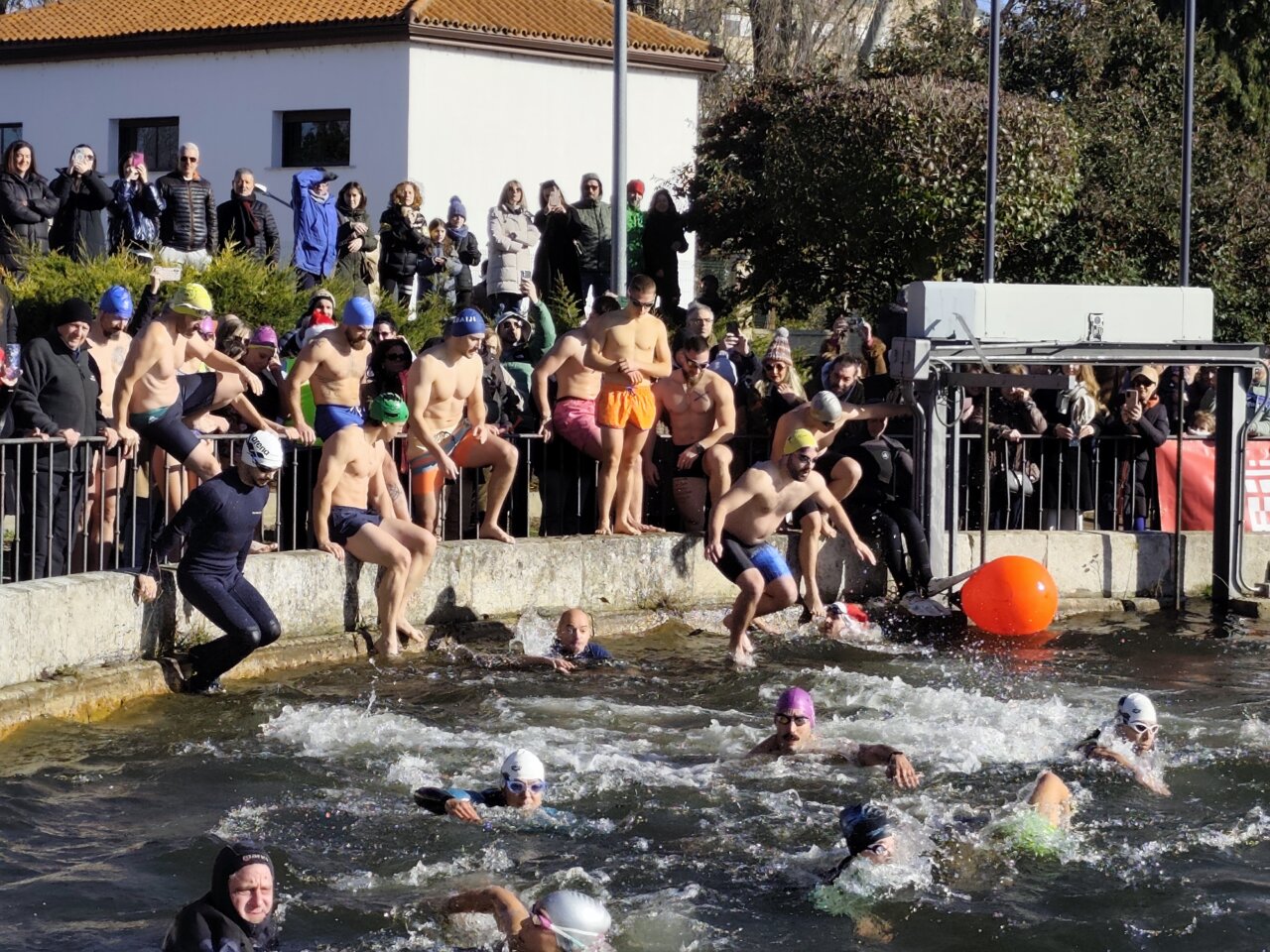 Unos 3 o 4 grados en el ambiente. Parecido en las poco luminosas aguas de la Dársena del Canal de Castilla y Palencia. A pocos de los presentes hoy desde las 12 horas en los entornos del Museo del Agua se les ocurría ir sin abrigo o sin gorro. Pero otros, una treintena, llevaban poco más que un gorro, un traje de neopreno y los más valientes, un bañador mondo y lirondo.