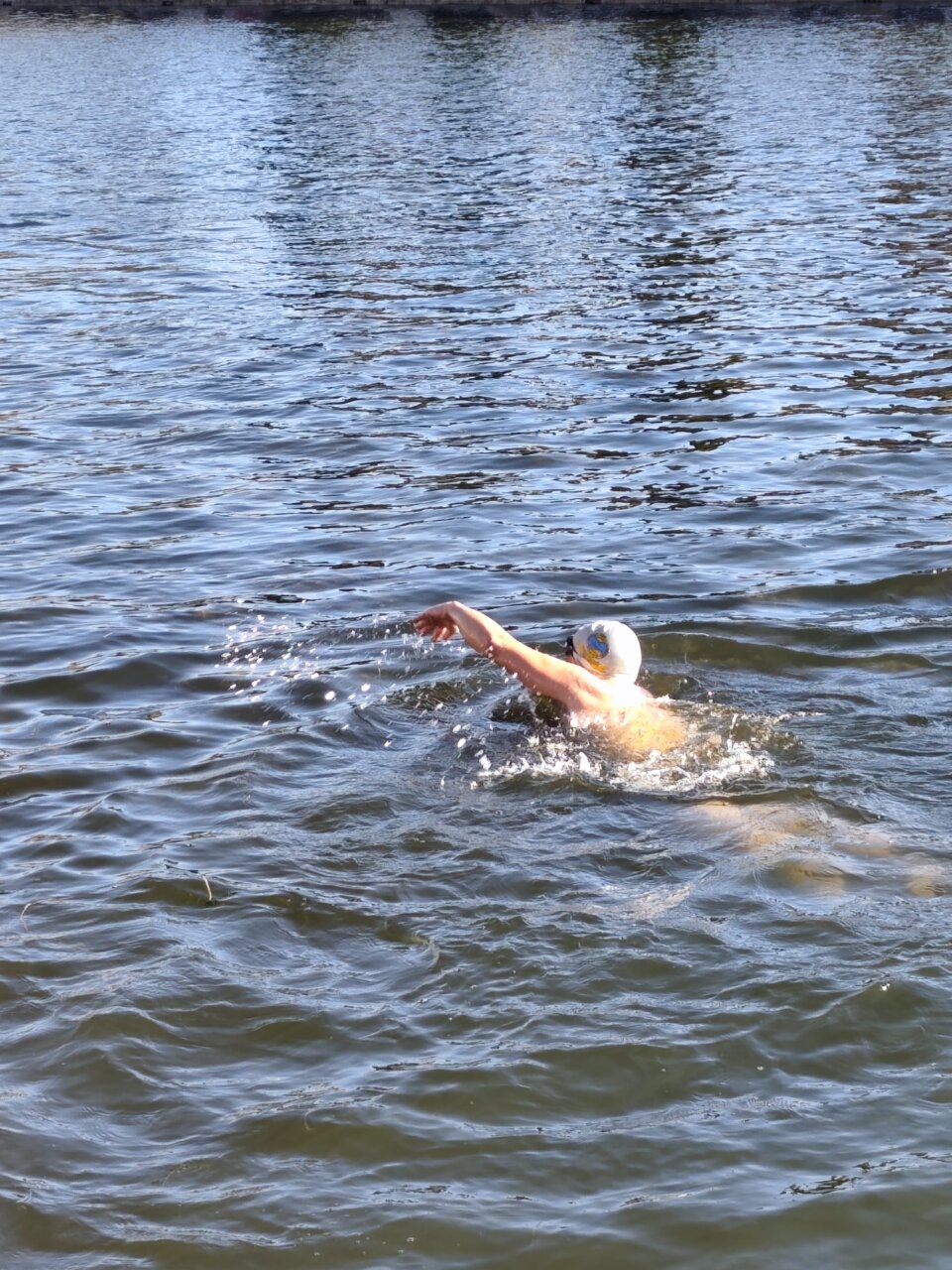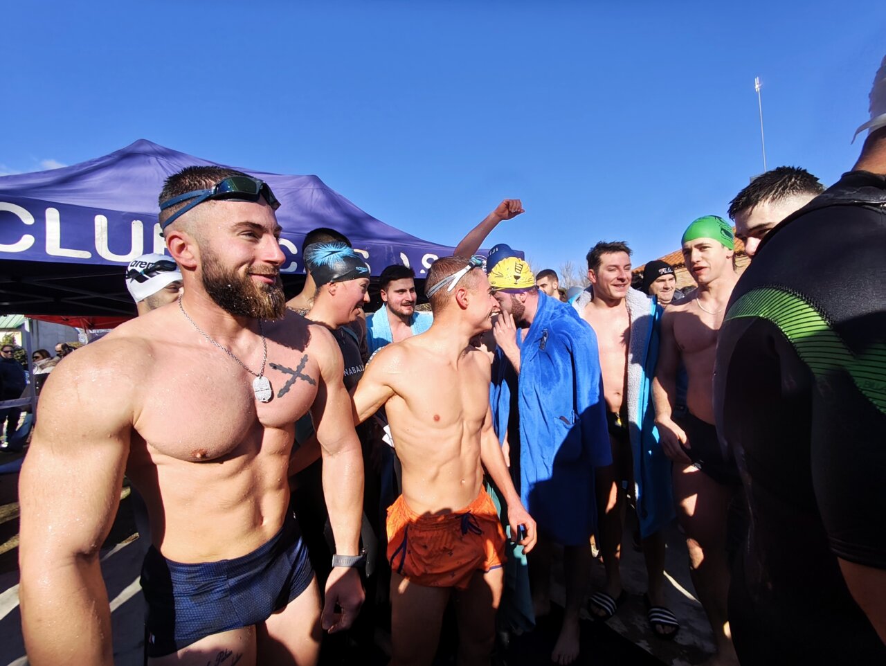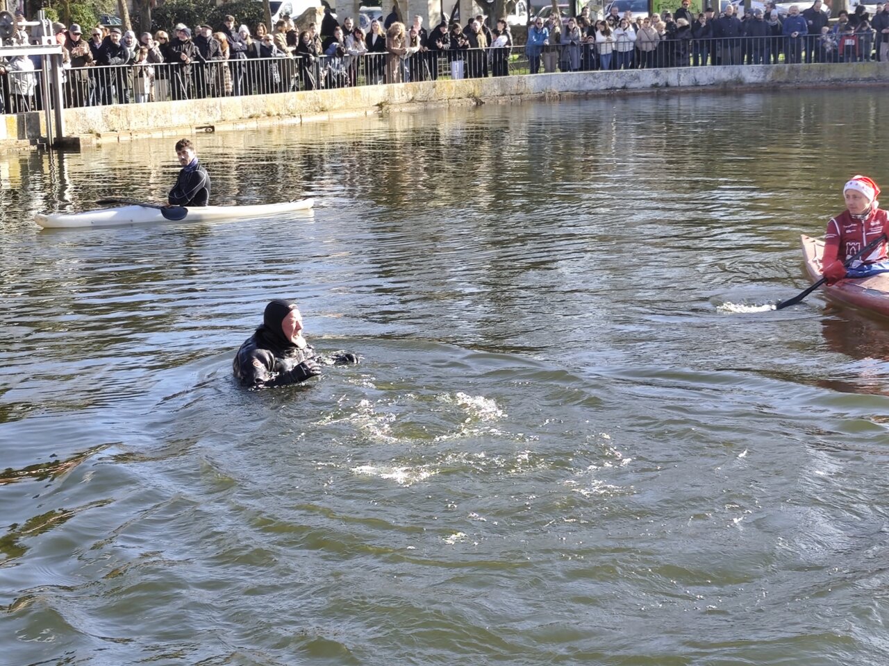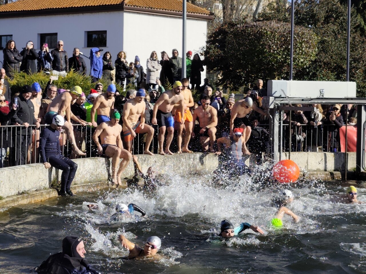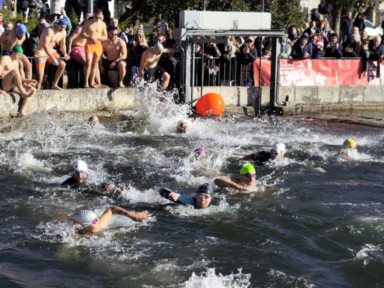 Unos 3 o 4 grados en el ambiente. Parecido en las poco luminosas aguas de la Dársena del Canal de Castilla y Palencia. A pocos de los presentes hoy desde las 12 horas en los entornos del Museo del Agua se les ocurría ir sin abrigo o sin gorro. Pero otros, una treintena, llevaban poco más que un gorro, un traje de neopreno y los más valientes, un bañador mondo y lirondo.