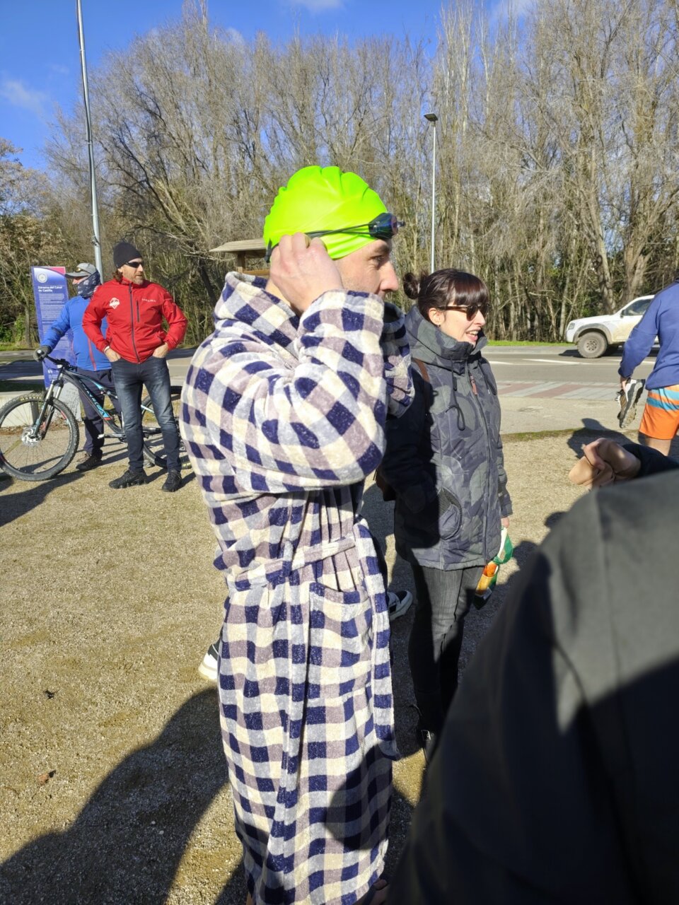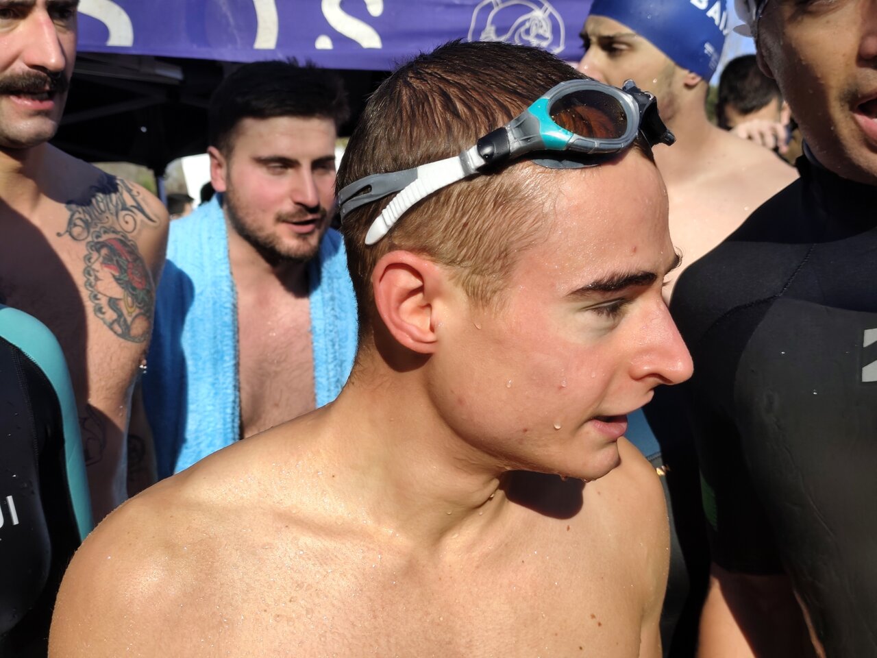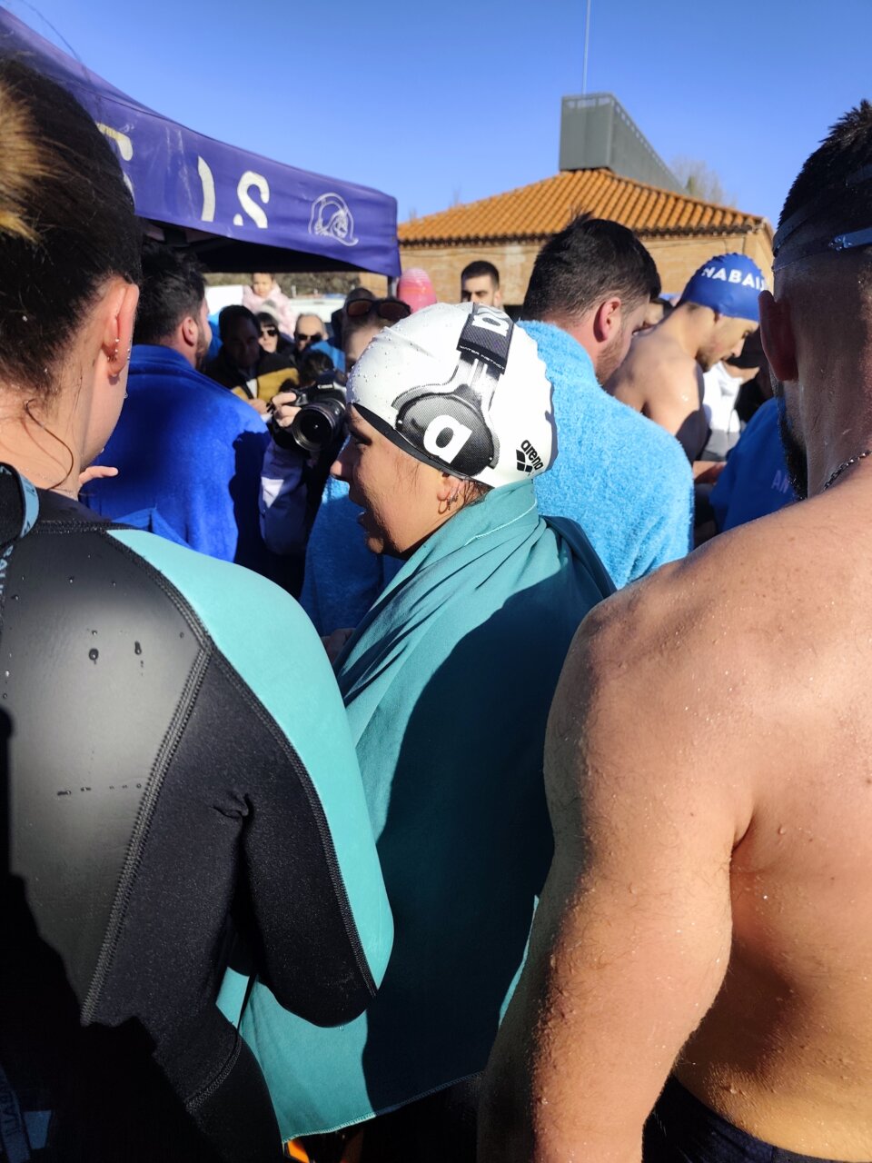 A la llegada de los participantes podía observarse la acción del agua fría en sus cuerpos. La más clara, los cercos de tono normal en sus ojo protegidos por gafas de buceo frente al enrojecimiento del resto del cuerpo expuesto al agua.
