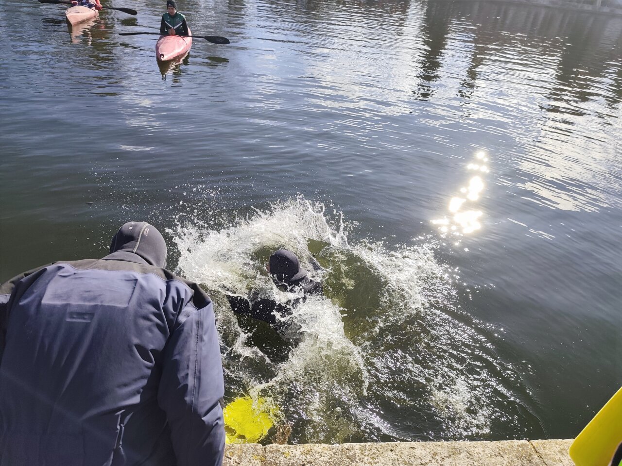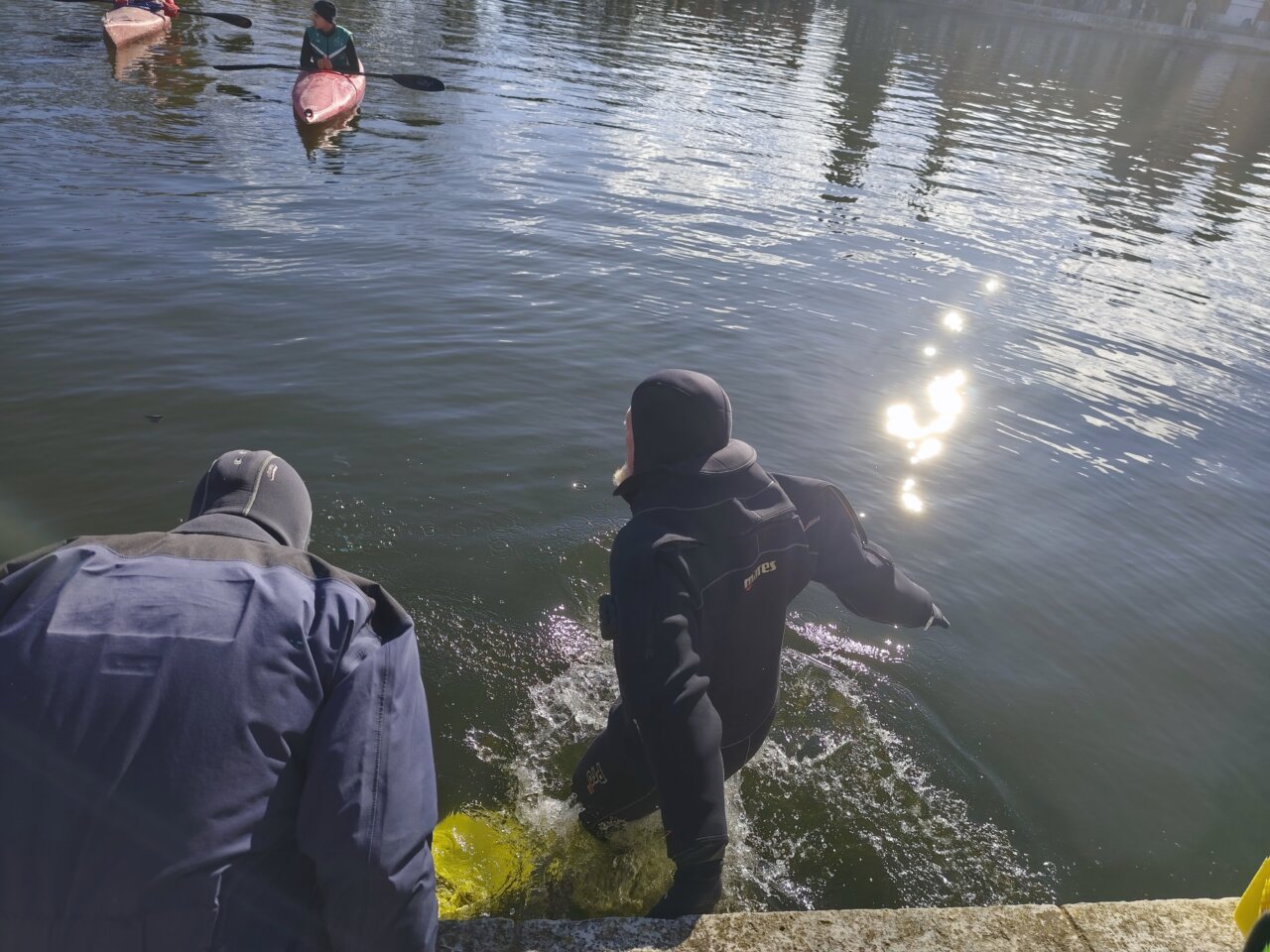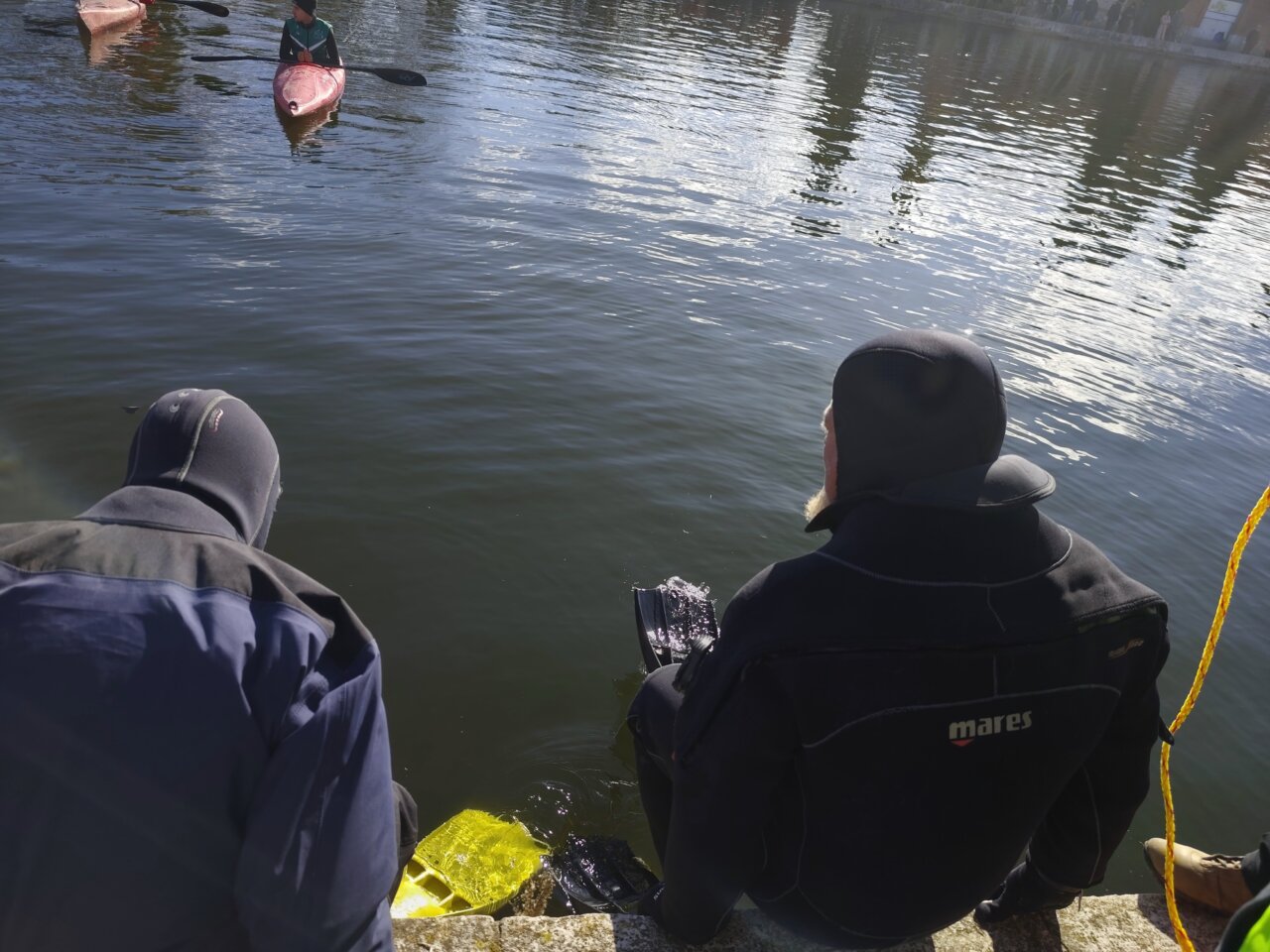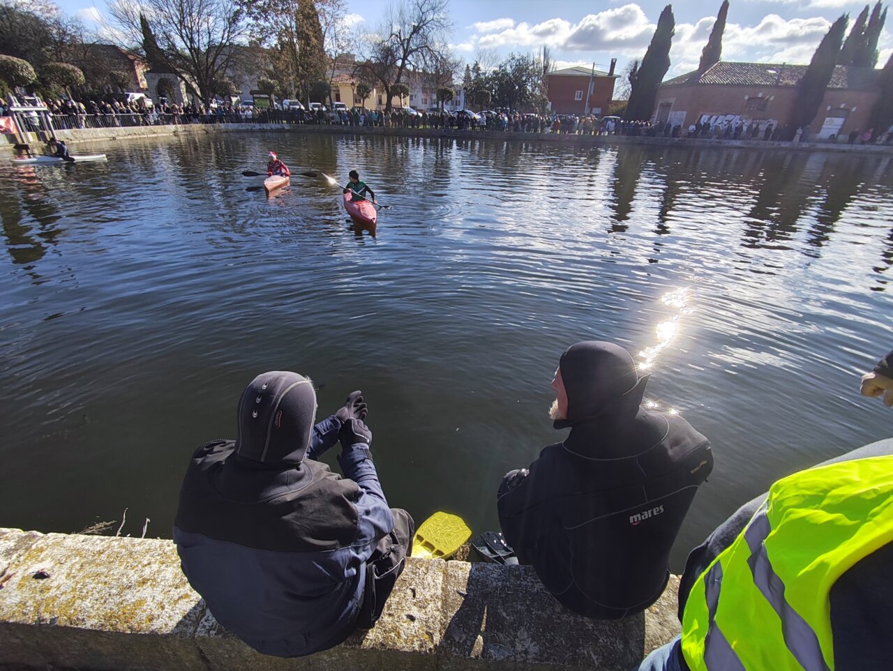 Por el camino, y listos por si había que intervenir, miembros del OCA SOS y de Skull Diving Team, entidades organizadoras junto al Ayuntamiento de Palencia, integrantes de ambos clubes equipados con trajes especiales para mantenerse en el agua por si había que rescatar a algún participante, ayudados por piraguas del club de piragüismo.